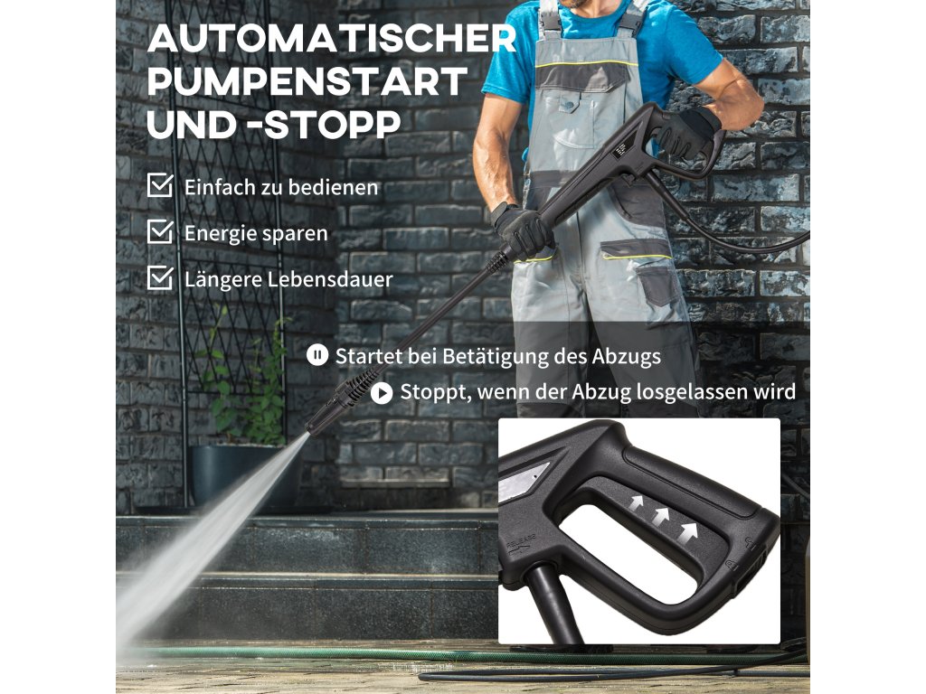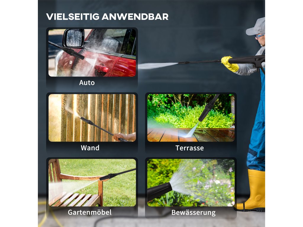 Dům vypadá zvenku staře? Auta jsou plná bláta a hmyzu? Pak se podívejte na tuto přenosnou tlakovou myčku od společnosti Outsunny. Čistič zvládne mnoho úkolů s vysokým výkonem: díky 1800wattovému motoru, vysokému tlaku 150 barů a průtoku 510 litrů za hodinu snadno odstraní i odolné skvrny. Hadice je dlouhá 6 metrů, napájecí kabel 5 metrů. Díky kolečkům se přístroj snadno pohybuje po zahradě.