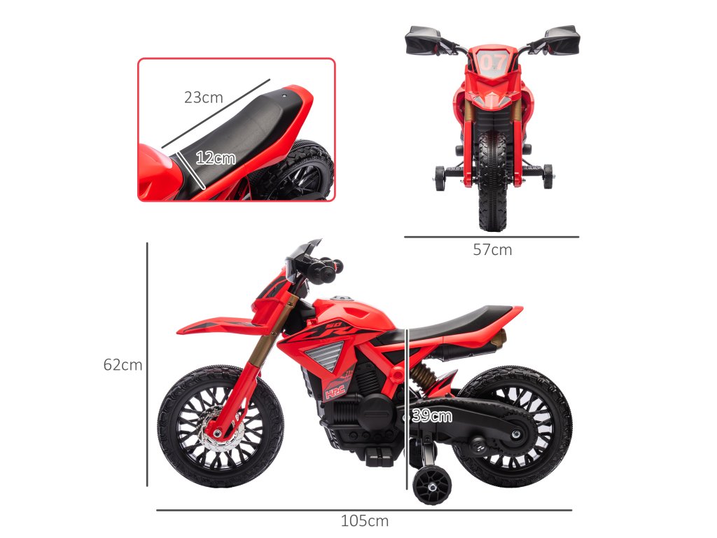 - Podrobnosti o výrobku dětské motorky: Celkové rozměry: 105L x 57W x 62H cm. Maximální zatížení: 30 kg. Doporučený věk: 3 až 8 let. Nutná montáž
