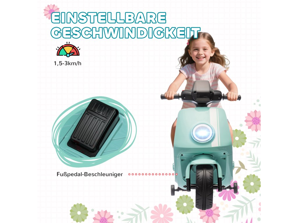 - ✔ Dvě nastavitelné rychlosti dětské elektrické motorky (1,5-3 km/h) s ovládáním nožním pedálem