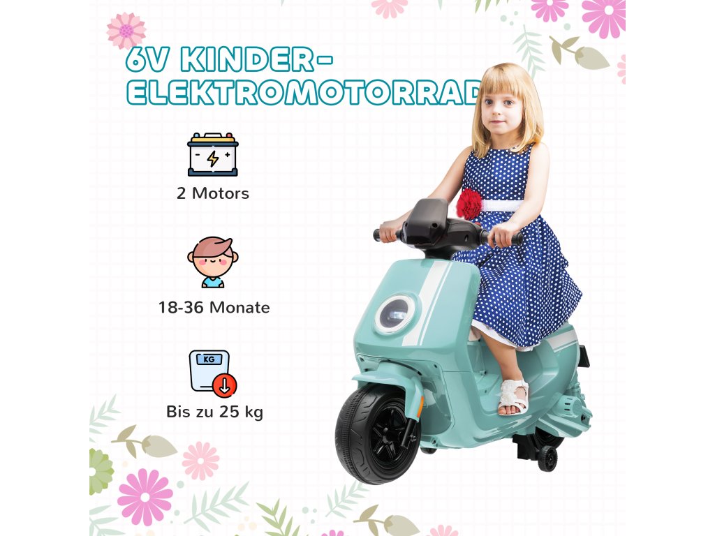 AIYAPLAY dětská elektrická motorka, 6V dětská motorka se světlometem, hudbou, rychlostí vpřed a vzad, tréninkovými koly, 1,5-3 km/h, elektrická motorka pro děti od 1,5 do 3 let, zelená barva