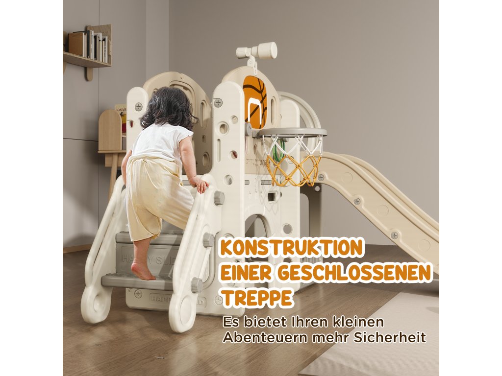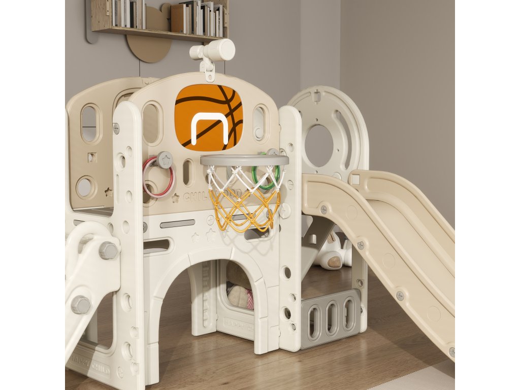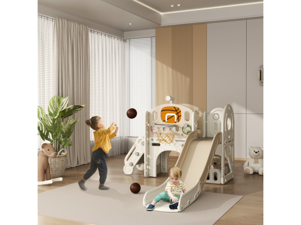 - Interaktivní sportovní zábava: Tato skluzavka se dvěma hracími kruhy na házení a basketbalovým košem včetně mini basketbalového míče je ideální pro podporu aktivní hry a rozvoj motorických dovedností hrou