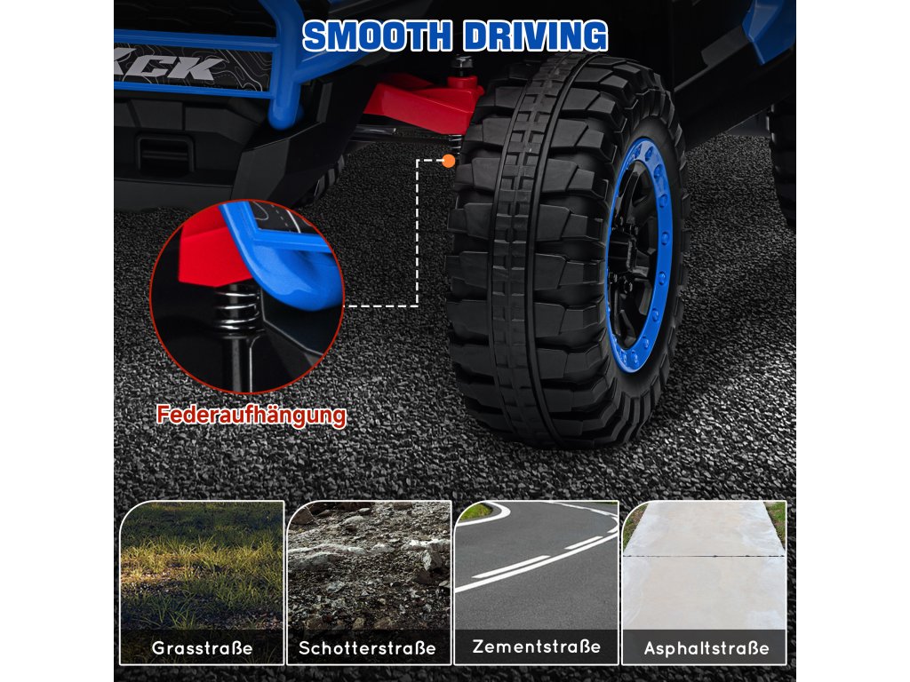 - Hladká jízda v jakémkoli terénu: Díky odpružení umožňuje toto dvoumístné elektrické autíčko pro děti pohodlnou jízdu na nejrůznějších površích, od trávy a štěrku až po cement a asfalt.