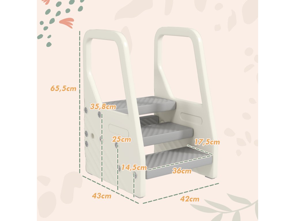 - Bezpečná a stabilní: Stupátko pro batolata má lichoběžníkovou konstrukci, protiskluzový povrch a podložky pod nohy i rukojeť. To zajišťuje bezpečnost a stabilní používání vaším dítětem