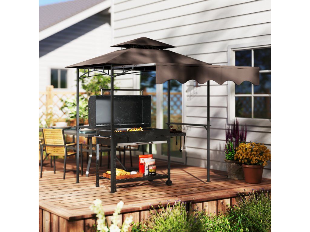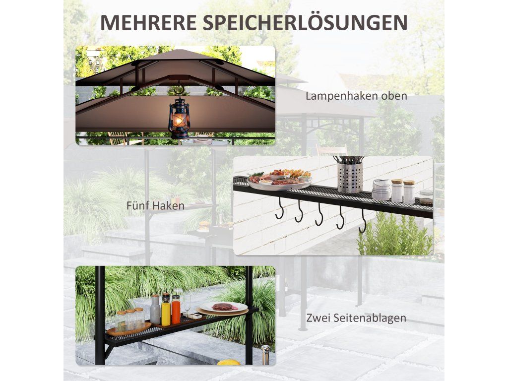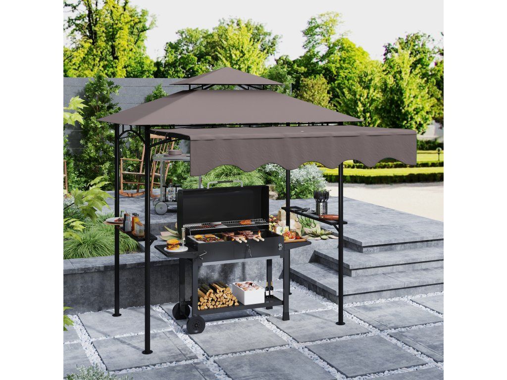 - ✔ Dvojitá horní konstrukce grilovacího altánu podporuje cirkulaci vzduchu a zabraňuje hromadění grilovacího kouře