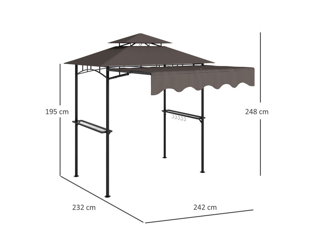 - Celkové rozměry pergoly: 242L x 149W x 248H cm. Nosnost: 20 kg (police), 2 kg (hák). Nutná montáž. Poznámka: Vhodné pro grily do šířky 180 cm, před nákupem si prosím zkontrolujte rozměry.