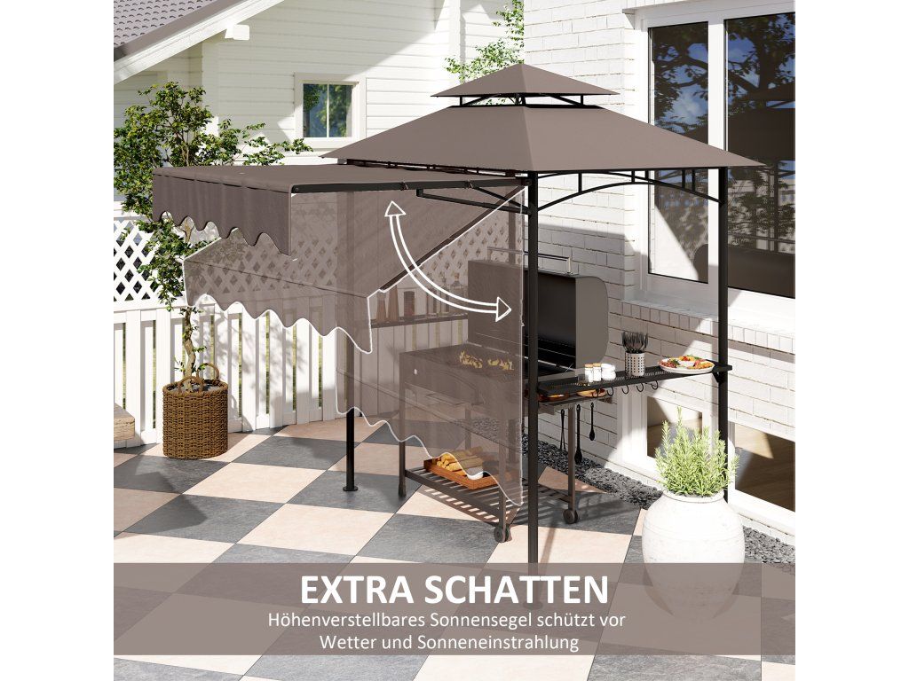 - ✔ Výškově nastavitelná střecha grilovacího altánu chrání před nepříznivým počasím a slunečním zářením