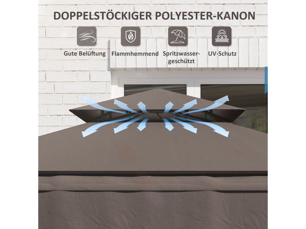 - Odvětrávaná konstrukce: Konstrukce s dvojitou střechou našeho grilovacího altánu zajišťuje vynikající cirkulaci vzduchu, rychlé rozptýlení kouře a dodatečnou bezpečnost díky střeše s PA povlakem, která je nehořlavá a odolná proti stříkající vodě.