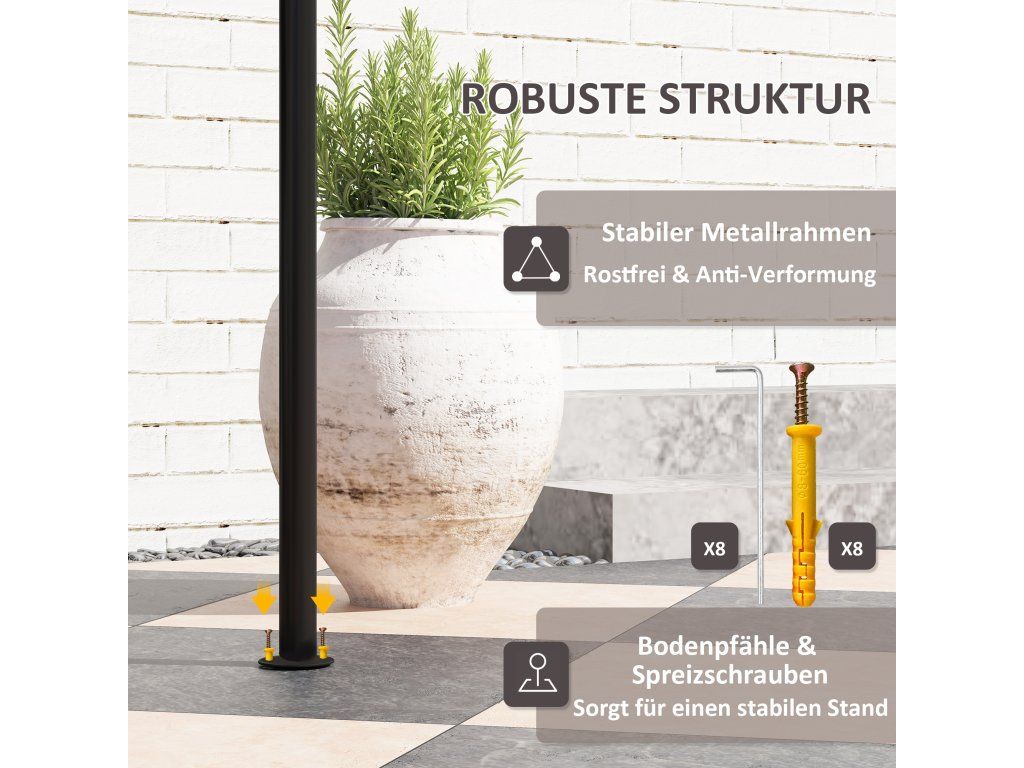 - Robustní konstrukce: Tento grilovací altán je vyroben z kovového rámu s práškovým nástřikem odolného proti povětrnostním vlivům a je dodáván s broušenými hřebíky a rozpěrnými šrouby pro stabilní montáž.