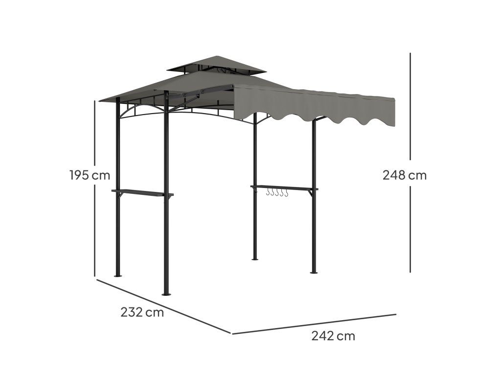 - Celkové rozměry pergoly: 242L x 149W x 248H cm. Nosnost: 20 kg (police), 2 kg (hák). Nutná montáž. Poznámka: Vhodné pro grily do šířky 180 cm, před nákupem si prosím zkontrolujte rozměry.