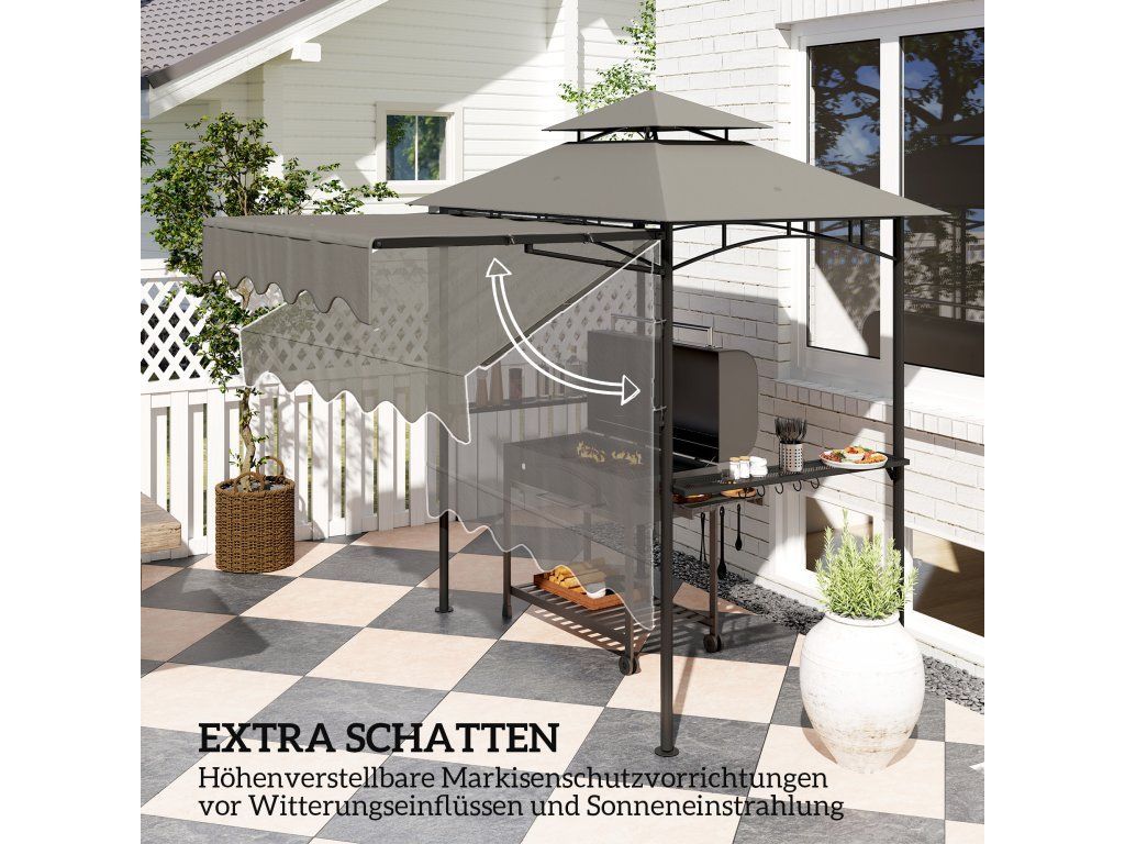 Zažijte grilování novým způsobem s grilovacím pavilonem [NÁZEV ZNAČKY]! Výškově nastavitelná markýza pergoly chrání před povětrnostními vlivy a sluncem, zatímco dvouplášťová střecha zajišťuje větrání a zabraňuje pronikání kouře. S nehořlavou střechou s povlakem PA odolným proti UV záření pro bezpečné grilování. Praktické boční police a háčky na grilovacím altánu z něj dělají dokonalý doplněk pro každého mistra venkovního grilování.