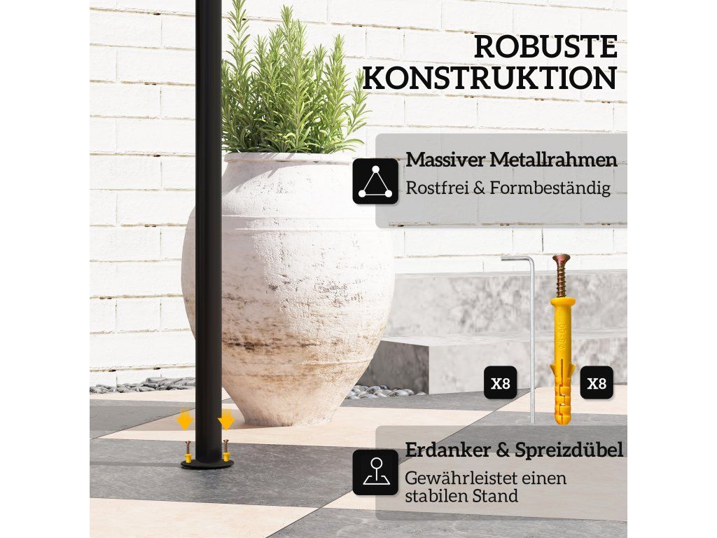 - Robustní konstrukce: Tento grilovací altán je vyroben z kovového rámu s práškovým nástřikem odolného proti povětrnostním vlivům a je dodáván s broušenými hřebíky a rozpěrnými šrouby pro stabilní montáž.