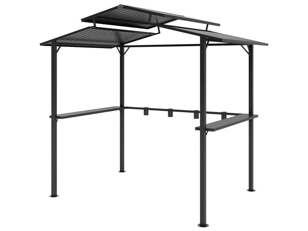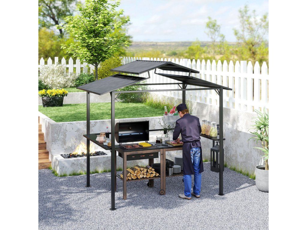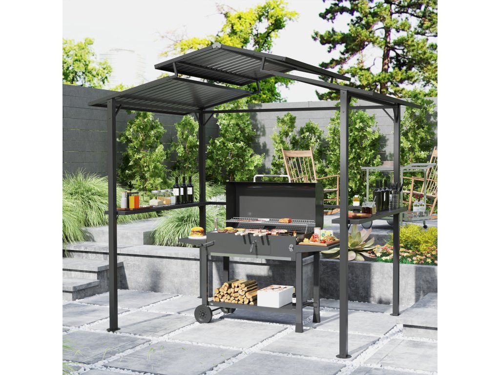 Zažijte grilování novým způsobem s grilovacím pavilonem [NÁZEV ZNAČKY]! S kovovou střechou pro optimální ochranu proti vodě a UV záření a dvojitou ventilační vrstvou, která zabraňuje kouři. Obsahuje užitečné police a držáky na nápoje, ideální pro venkovní použití. Vhodný pro grily o šířce až 120 cm. Tento robustní grilovací pavilon odolá i silnému větru!