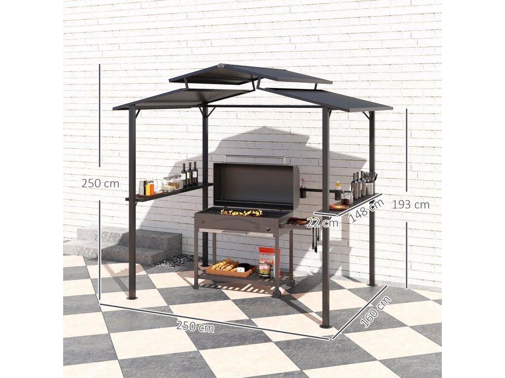 - Informace o grilovacím altánu: Celkové rozměry: 250L x 160W x 250H cm. Nosnost regálu: 30 kg. Nutná montáž: Vhodné pro všechny typy grilů, které se nacházejí v zahradě.