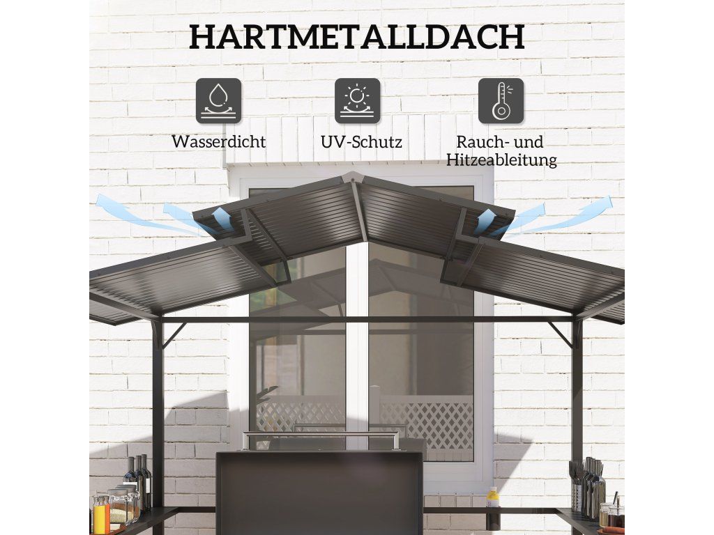 - Rozšířená ochrana před povětrnostními vlivy: Tento grilovací altán poskytuje účinnou ochranu před UV zářením a deštěm. Díky inteligentnímu ventilačnímu systému optimálně odvádí kouř a teplo a vydrží sníh o hmotnosti až 100 kg.