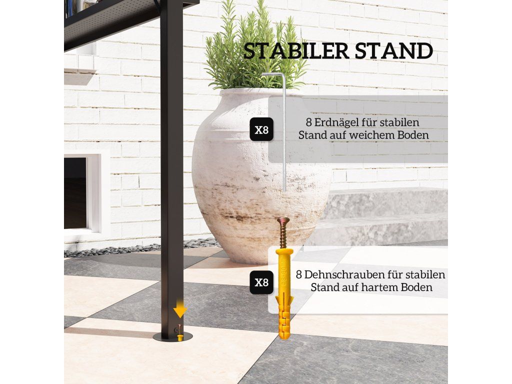 - Stabilní a bezpečný: Altán na grilování je vybaven kovovým rámem s práškovým nástřikem a je zajištěn osmi zemními hroty nebo rozpěrnými hmoždinkami, takže zůstává stabilní a bezpečný i při rychlosti větru až 61 km/h.