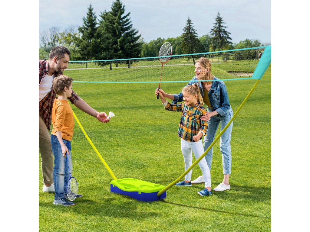 - Nastavitelná výška: Tato badmintonová sada se sítí má prodlužovací tyče, které umožňují snadné nastavení výšky pro badminton i volejbal