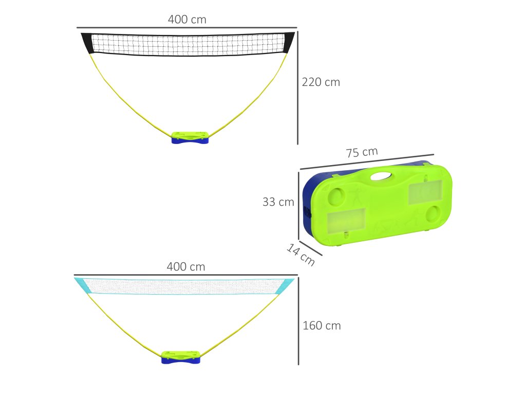 - Celkové rozměry badmintonové sady: 400 D x 22,4 Š x 155 V cm. Kompletní sada obsahuje 1 x přenosnou tašku, 1 x badmintonovou síť a 1 x volejbalovou síť