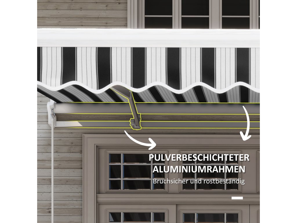 Tato velká zatahovací kazetová markýza od společnosti Outsunny je ideální volbou pro každého, kdo chce proměnit svou terasu ve stinnou relaxační zónu! Tato markýza se skládacími rameny nevyžaduje připojení k elektrické síti. Můžete ji nastavit, aniž byste se museli starat o kabely, zásuvky nebo baterie. Ruční klika o délce 1,5 metru otevírá markýzu jemně a tiše. Obzvláště praktické: tuto sluneční clonu lze připevnit téměř na jakýkoli povrch stěny.