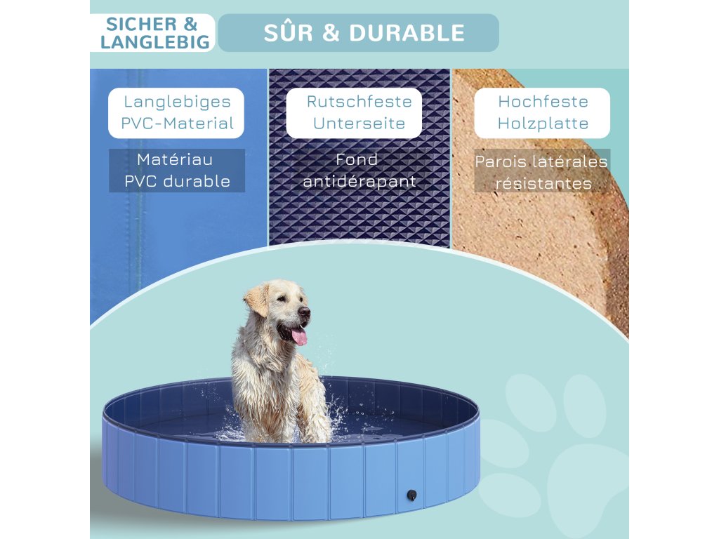 - VYSOKÁ KVALITA: Bazén pro psy je vyroben z voděodolného plastu jako krytu a kvalitní dřevěné desky jako stěny. Okraj je pro větší odolnost vyztužen.