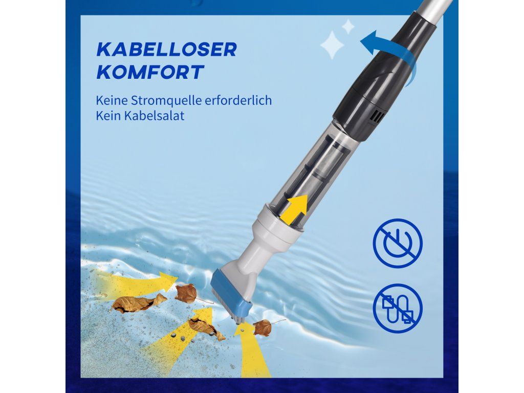 S bezdrátovým a lehkým bazénovým vysavačem od [NÁZEV ZNAČKY] je čištění bazénu hračka. Vysavač se ovládá pouze jednou rukou a díky délkově nastavitelné rukojeti jej můžete pohodlně držet v požadované výšce. Díky vysokému sacímu výkonu až 19 litrů za minutu a dlouhé provozní době 80 minut je čištění rychlé a snadné. Průhledná přihrádka na nečistoty usnadňuje vyprazdňování a čištění vysavače. Nutnost pro každého majitele bazénu!