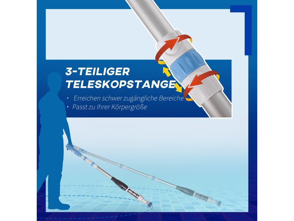 - Nastavitelná rukojeť: Vysavač má třídílnou teleskopickou rukojeť, kterou lze prodloužit ze 106 cm až na 162 cm, což usnadňuje sběr nečistot ze dna bazénu a dalších těžko přístupných míst. Zároveň si můžete zvolit nejpohodlnější délku podle své výšky.