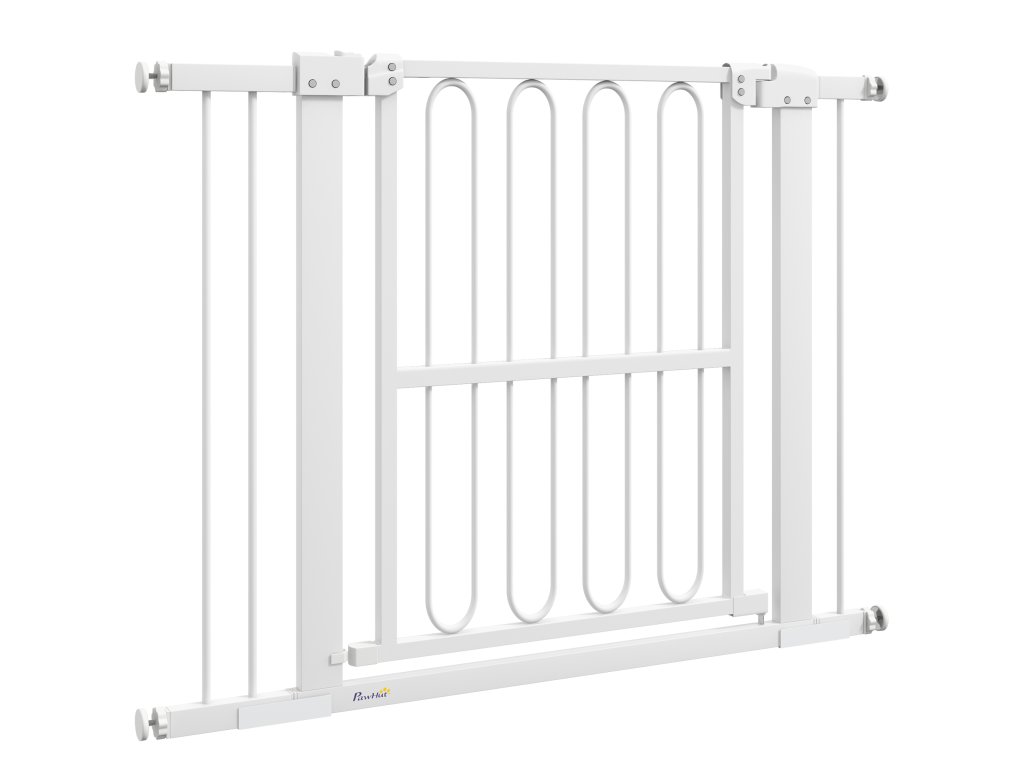 Bezpečnostní branka do dveří PawHut pro psy, schodišťová branka 76-104 cm bez vrtání, uzamykatelná schodišťová branka, bezpečnostní branka pro všechny velké psy, ocelová, bílá