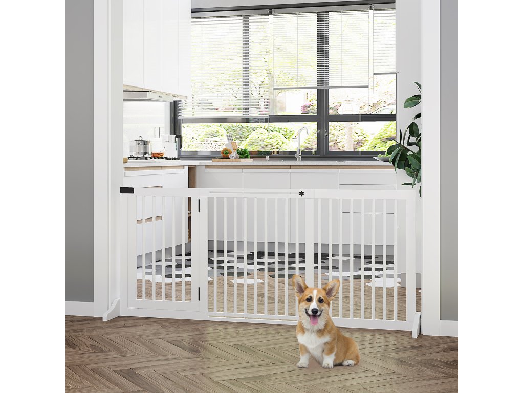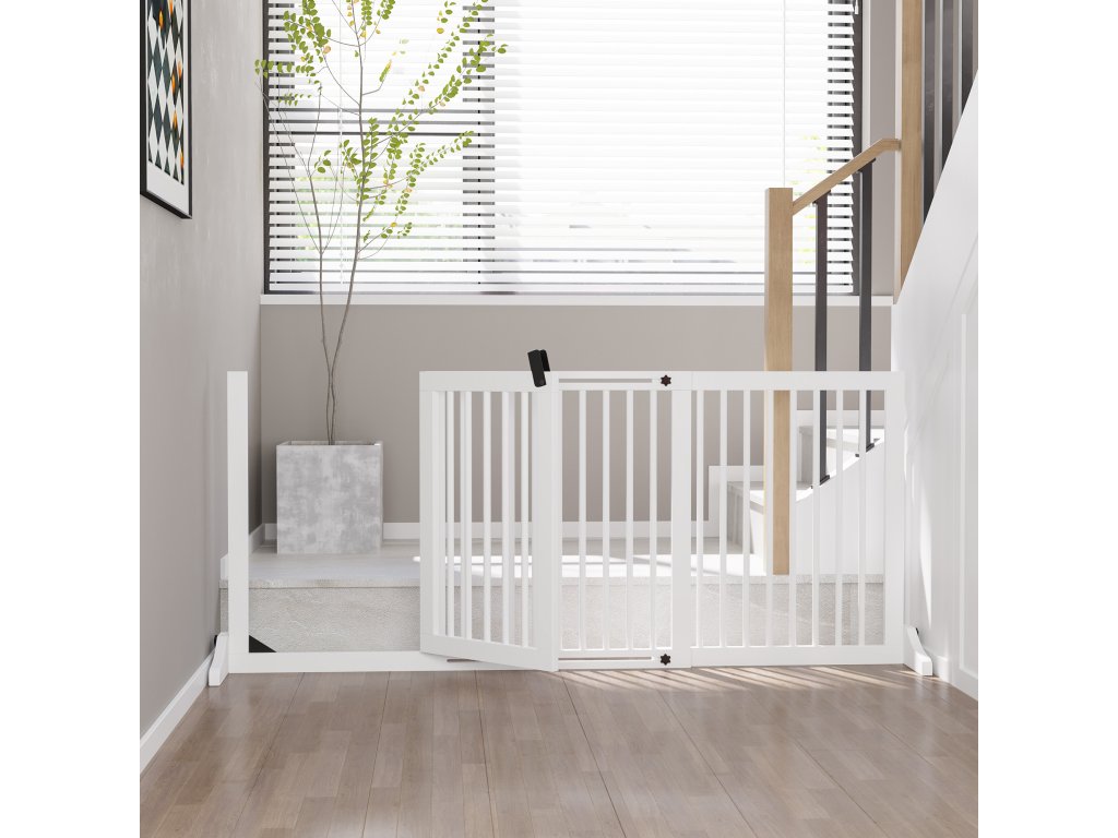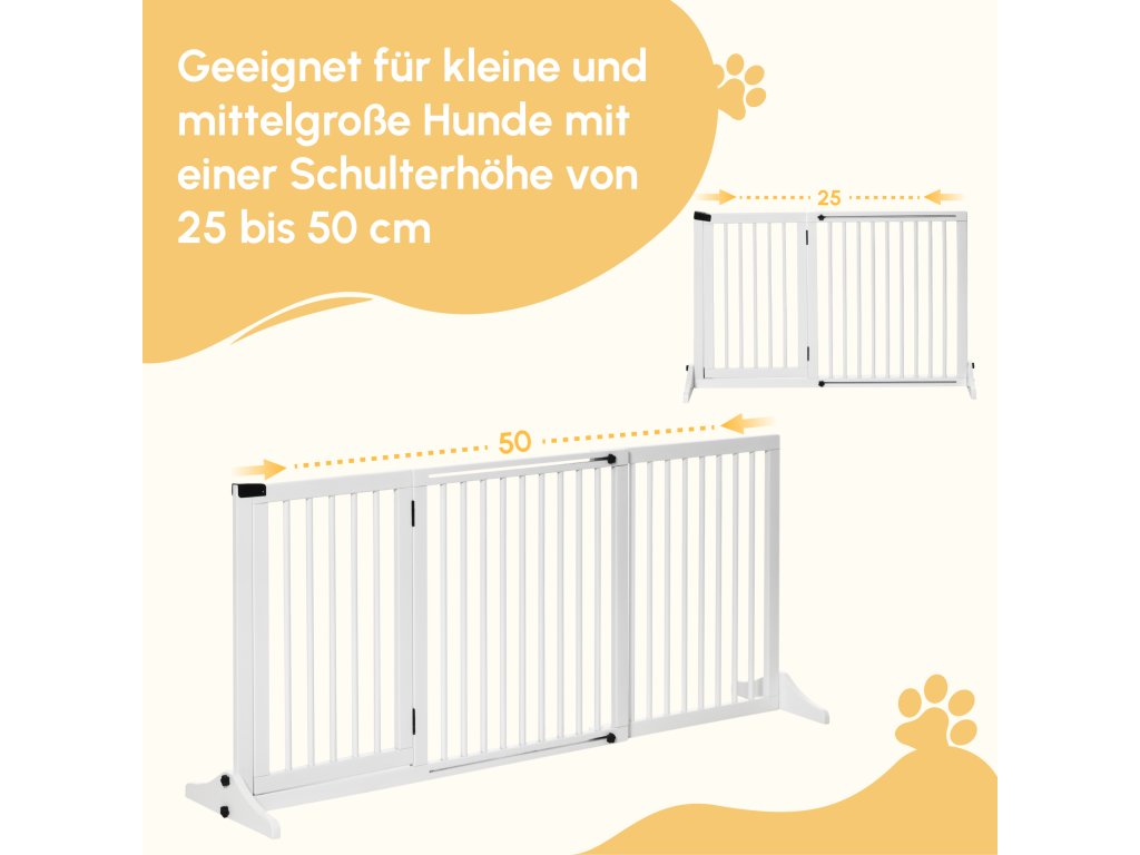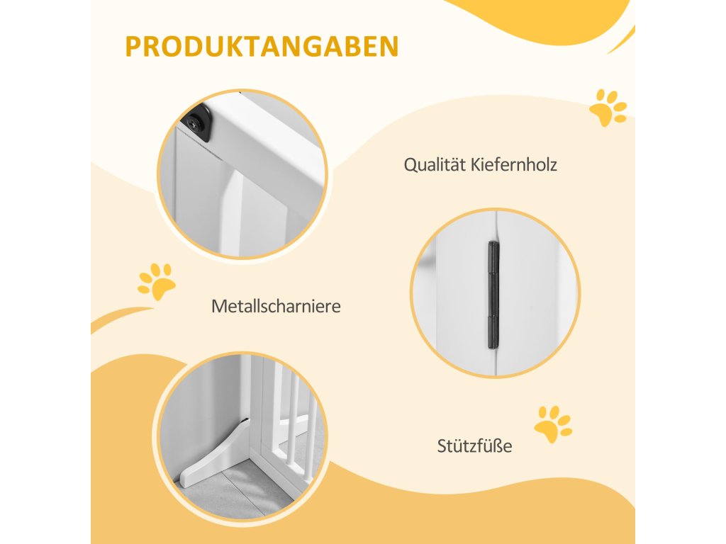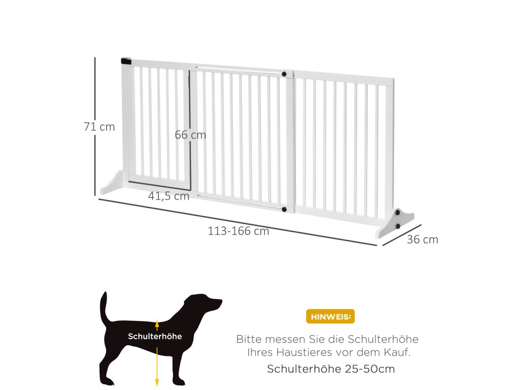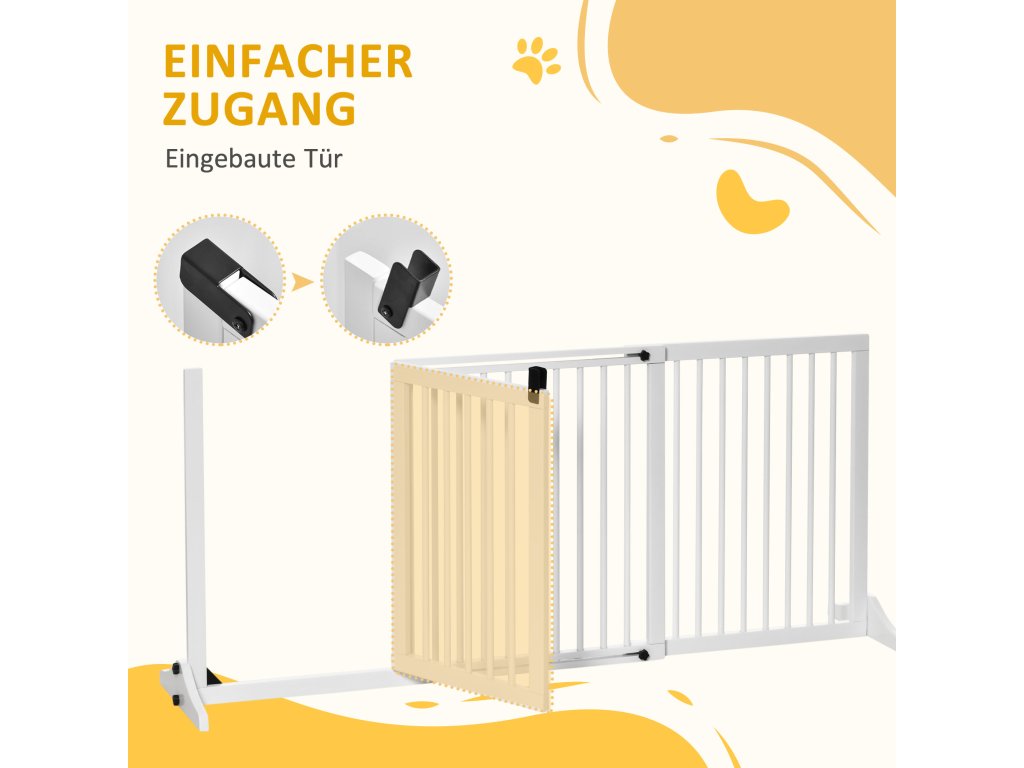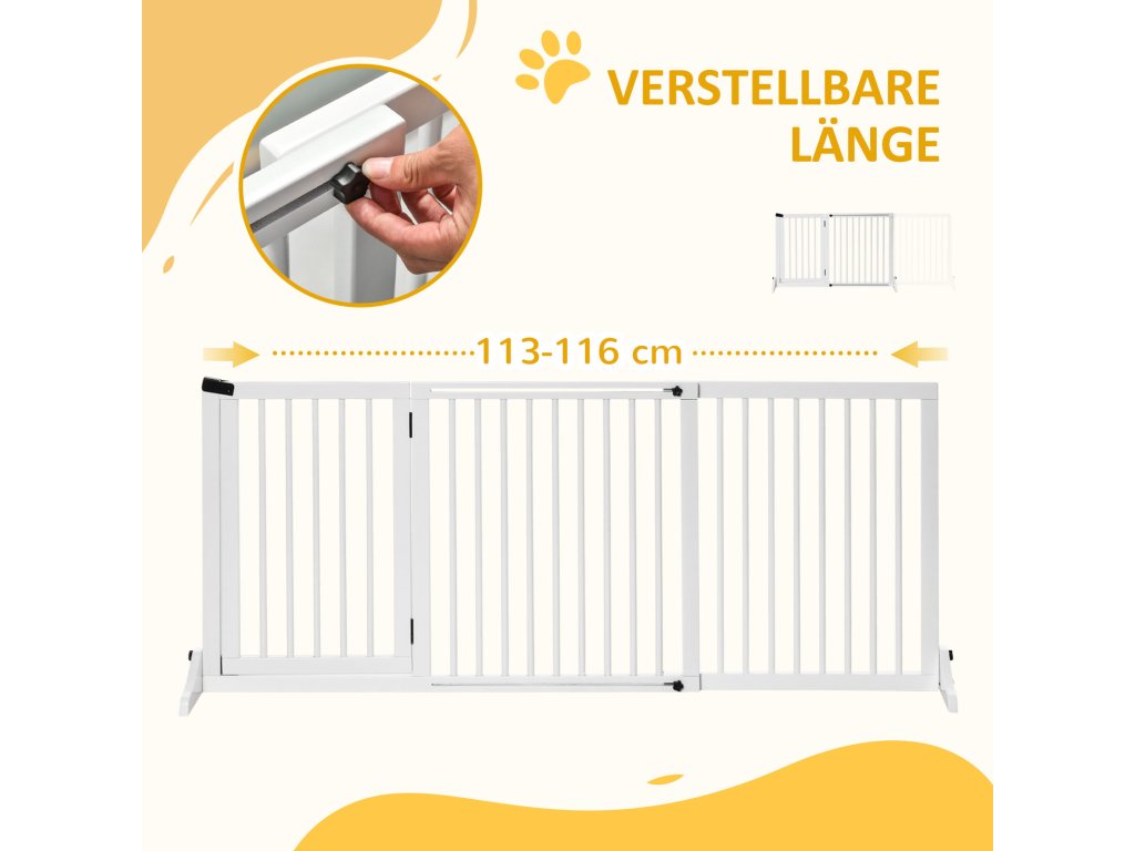 Bezpečnostní branka PawHut pro psy s dvířky Volně stojící bezpečnostní branka ze dřeva s dvířky v bílé barvě 113-166x36x71cm ideální pro ochranu domácích zvířat | Aosom.de