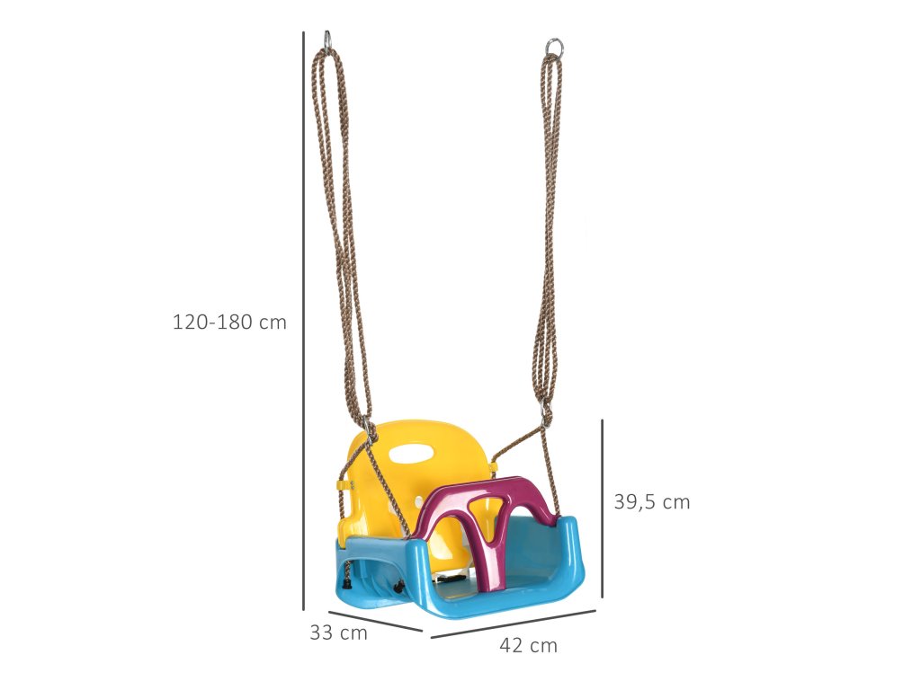 - Údaje o výrobku: Sedačka je určena pro děti, které se mohou houpat na houpačce: Celkové rozměry: 42L x 33W x 120-180V cm. Vhodné pro děti ve věku od 9 do 36 měsíců. Nosnost: 70 kg. Nutná montáž.