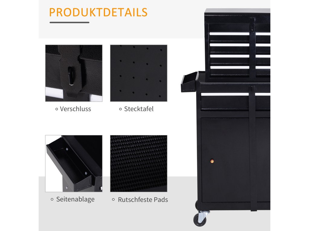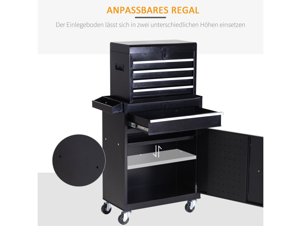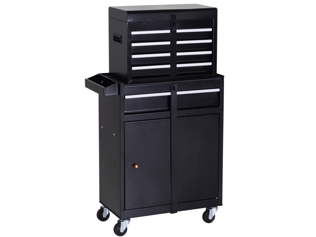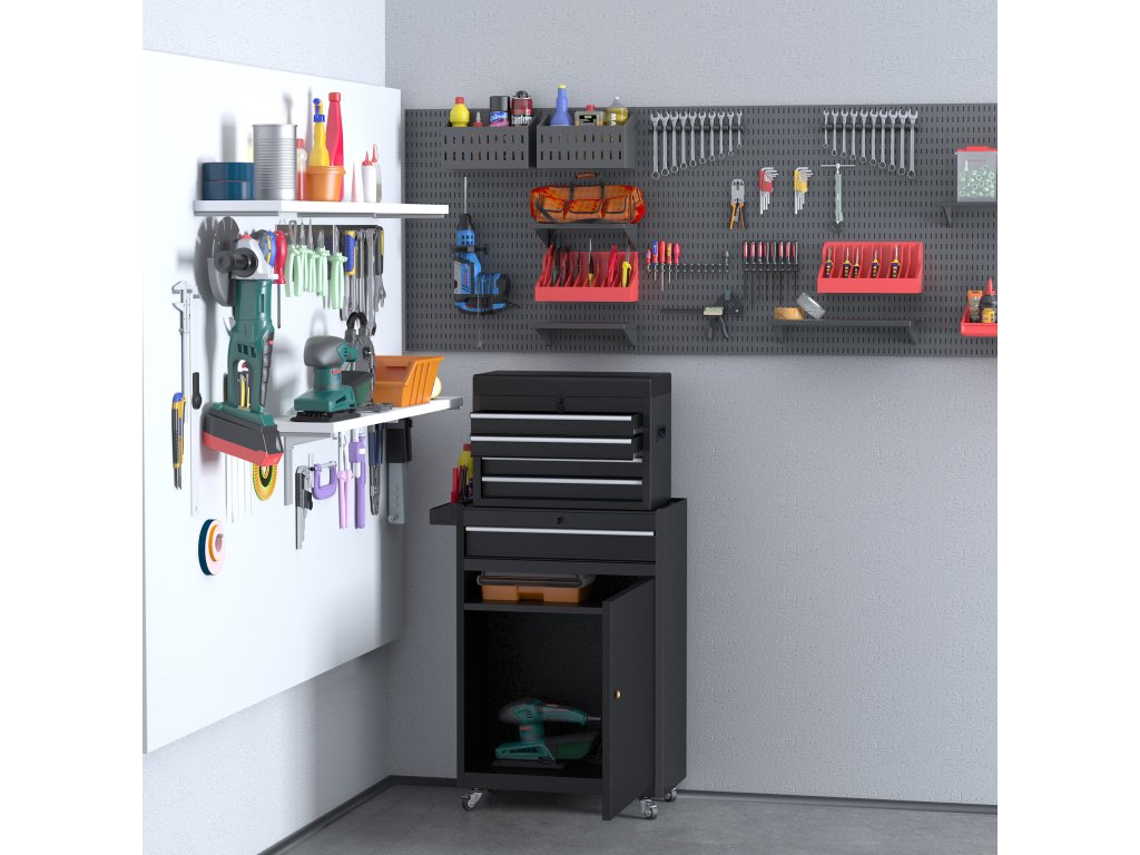 Něco se tam vejde: Prostorná skříňka na nářadí od společnosti DURHAND má prostornou spodní skříňku s jednou velkou a čtyřmi menšími zásuvkami a také vyjímatelný box na nářadí. Na vnitřní straně dvířek skříňky najdete praktickou kolíčkovou desku na nářadí, které používáte nejčastěji a chcete ho mít rychle po ruce. Skříňka na nářadí je ideální do garáže, dílny nebo kůlny na nářadí.
