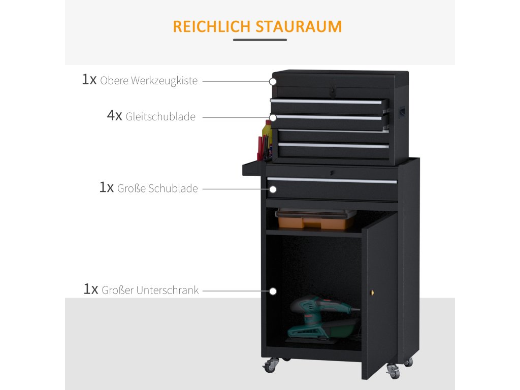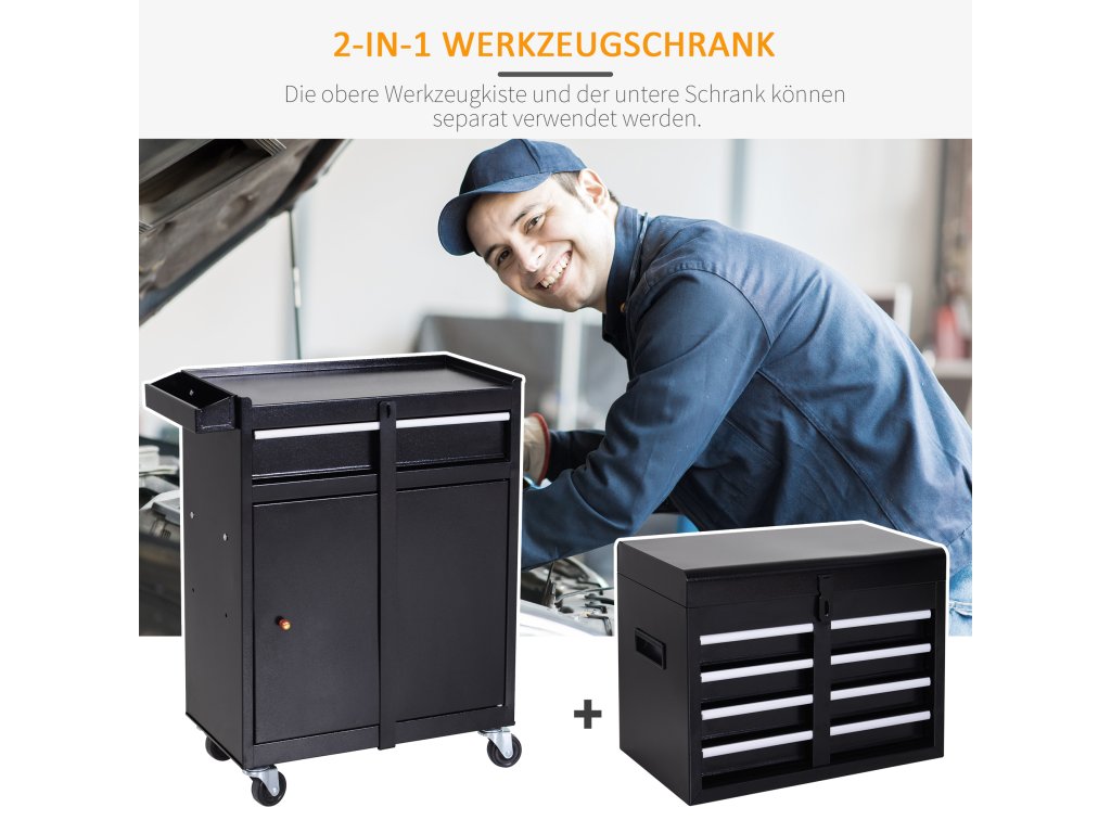 - Bezpečnost: Základní skříňka a box na nářadí jsou vybaveny zámky. To znamená, že vše zůstane na svém místě, i když se skříňka přemístí. Zásuvky jsou z vnitřní strany polstrované.