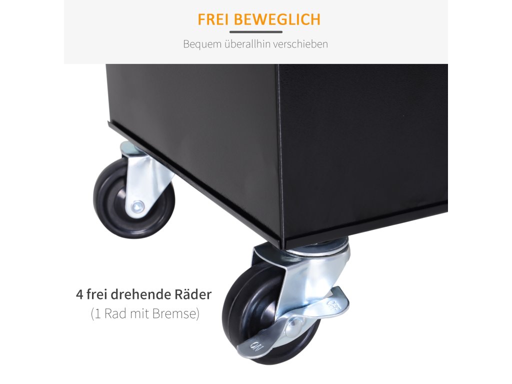 - Mobilní: Skříň lze přemisťovat na čtyřech gumových kolečkách o 360°. Jedno z kol je vybaveno parkovací brzdou.