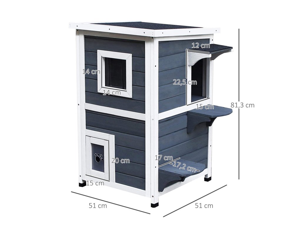 Domeček pro kočky PawHut šedý 2patrová vila pro kočky se schody, asfaltová střecha a okna, jedlové dřevo, 51x51x81,3cm pro milovníky koček | Aosom.de