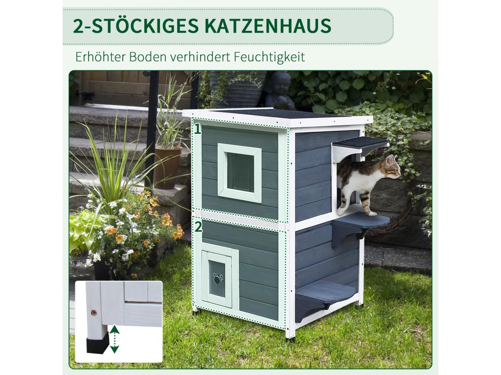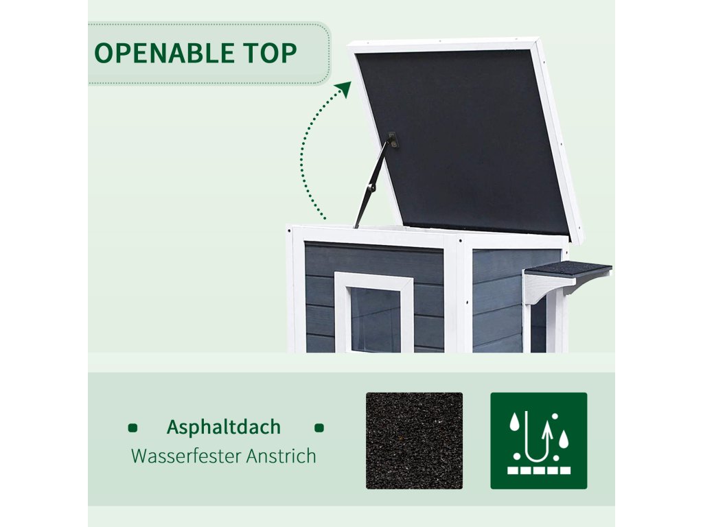 - Pro venkovní a vnitřní použití: Díky asfaltové střeše, voděodolnému nátěru a vyvýšeným nohám je domeček pro kočky ideální pro venkovní i vnitřní použití.