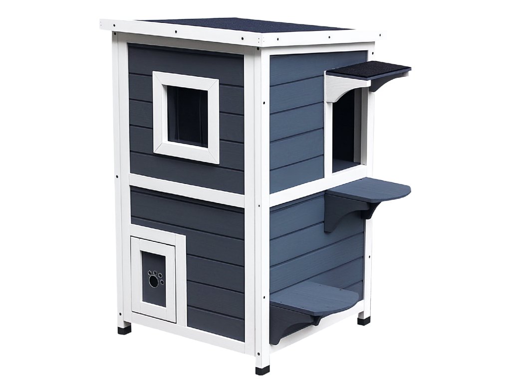Ideální domov pro vaši zatoulanou kočku. Náš snadno udržovatelný kočičí domek z jedlového dřeva nabízí vašim malým kamarádům nejen ochranu, ale také místo na hraní a úkryt. Snadno otevíratelná horní část a odnímatelný středový panel usnadňují nastavení a čištění integrovaného zásobníku na stelivo. Díky asfaltové horní části, voděodolnému nátěru a vyvýšeným nohám je kočičí domeček ideální pro použití uvnitř i venku, a to i za nepříznivého počasí.