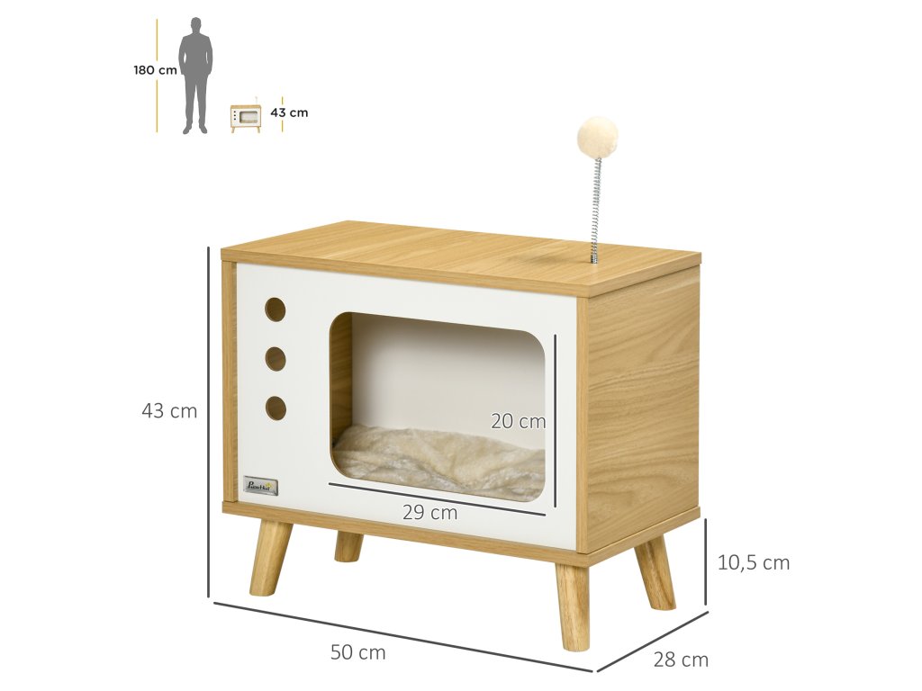 Domeček pro kočky PawHut v TV designu, míček a polštářek v ceně, koš pro kočky, dub/béžová/bílá, 50x28x43cm| Aosom