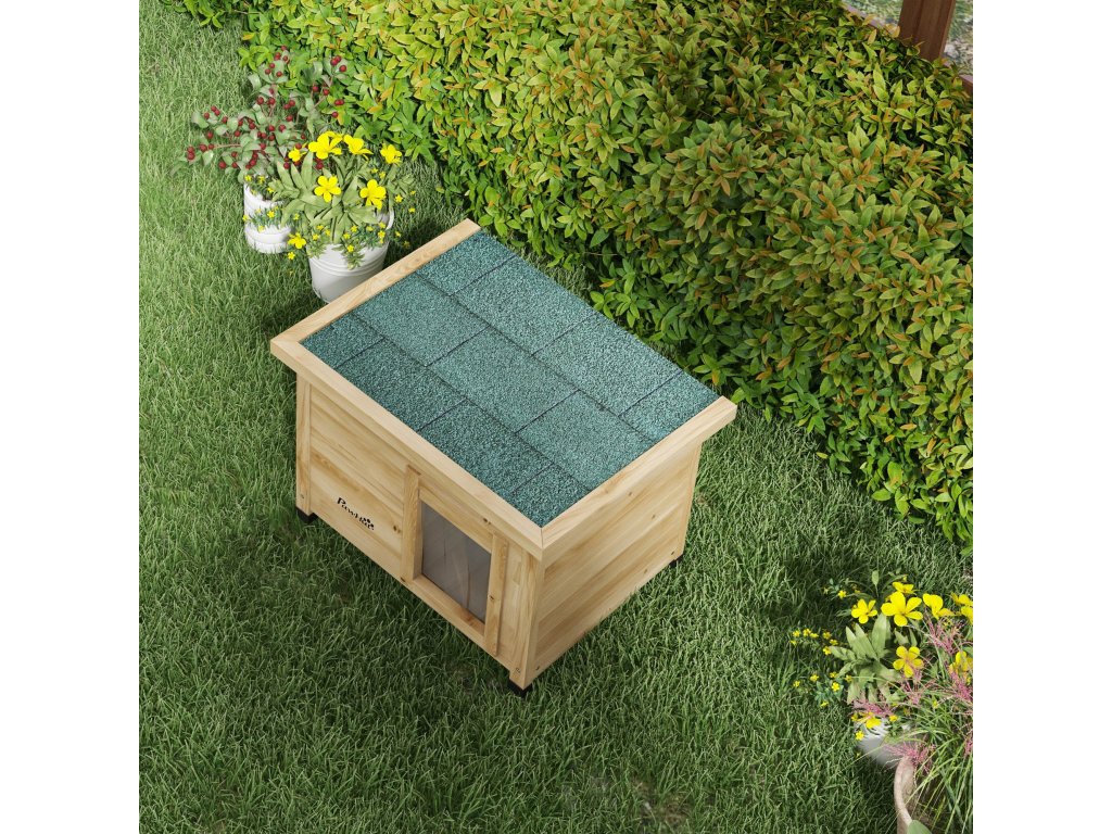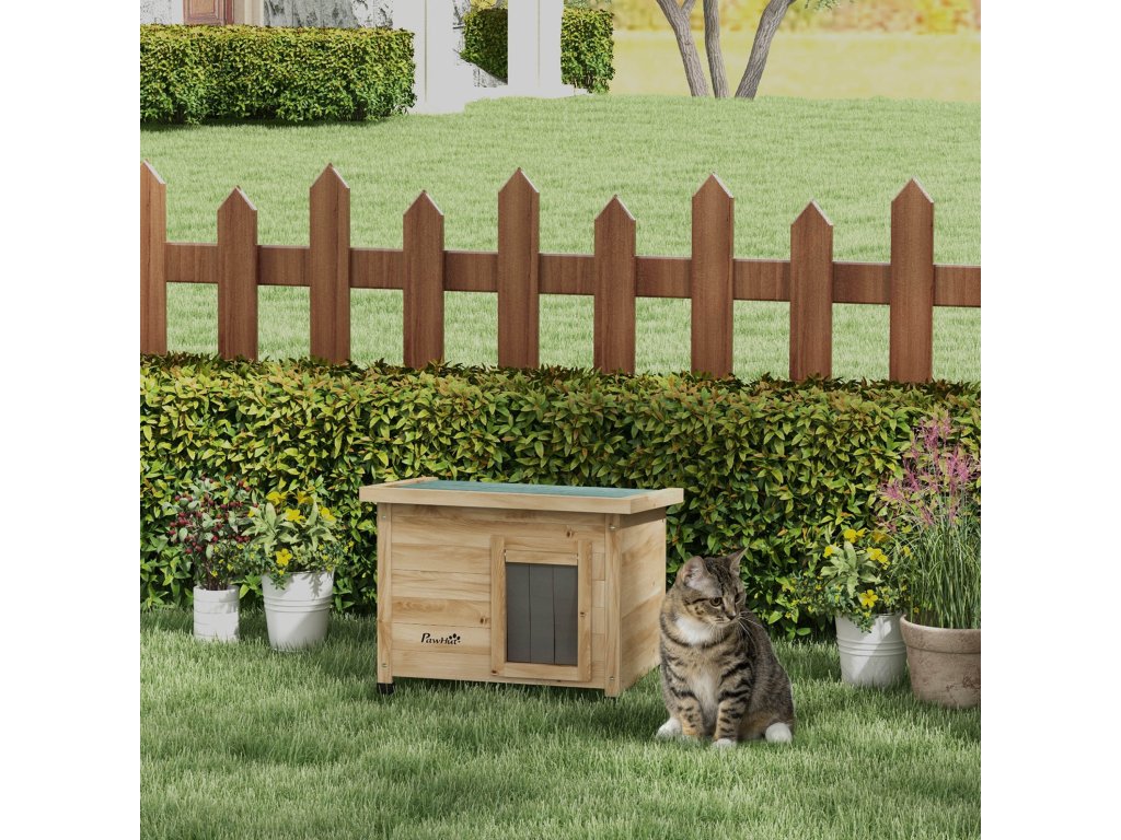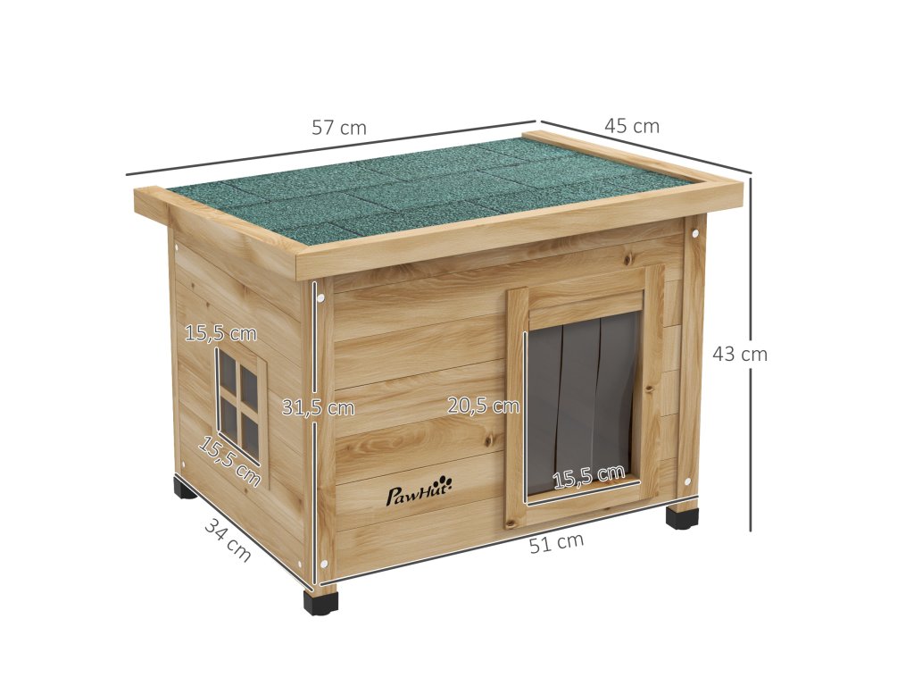 - Šikmá střecha: Střecha pokrytá asfaltem umožňuje stékání vody, takže nemůže proniknout do vnější části kočičího domku - vynikající kombinace tepla v zimě a stínu v létě