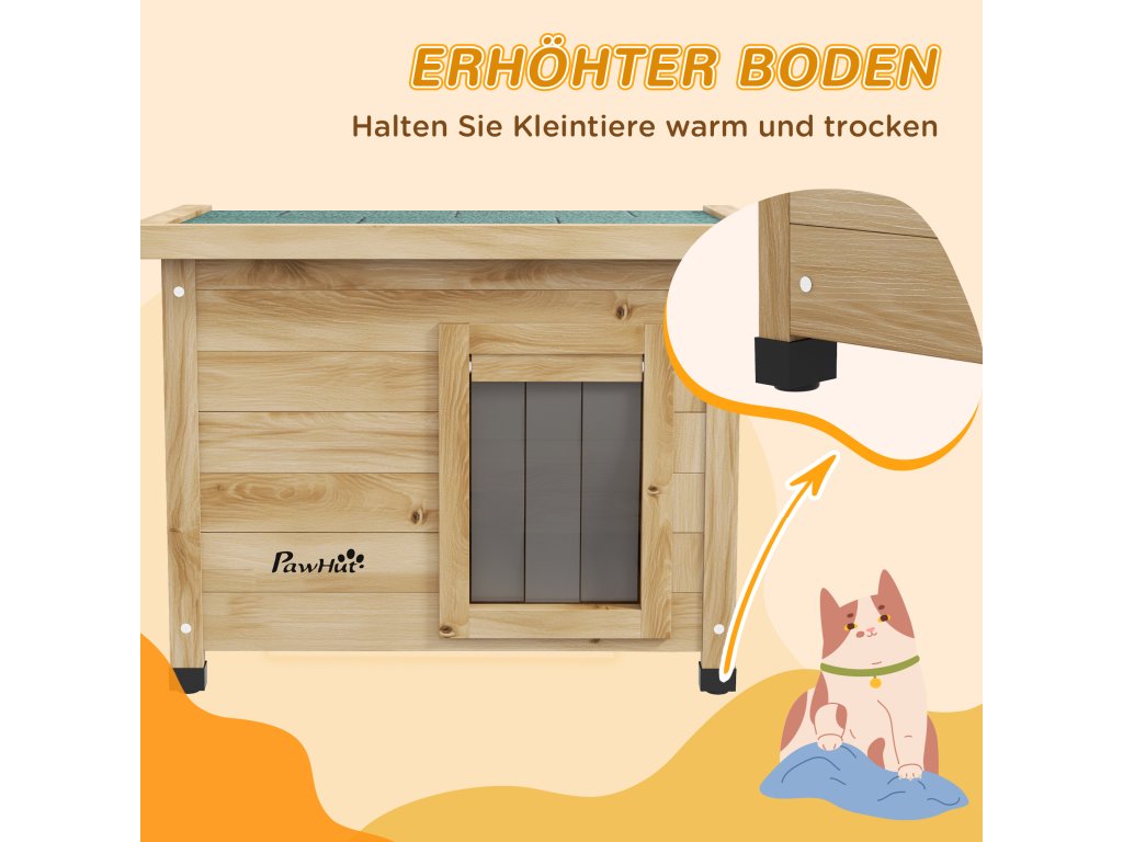 Dřevěný domeček pro kočky PawHut, venkovní kočičí bouda, vyvýšená kočičí jeskyně se závěsem na dvířkách, žlutá barva, 57 x 45 x 43 cm, ideální pro malá zvířata | Aosom.de