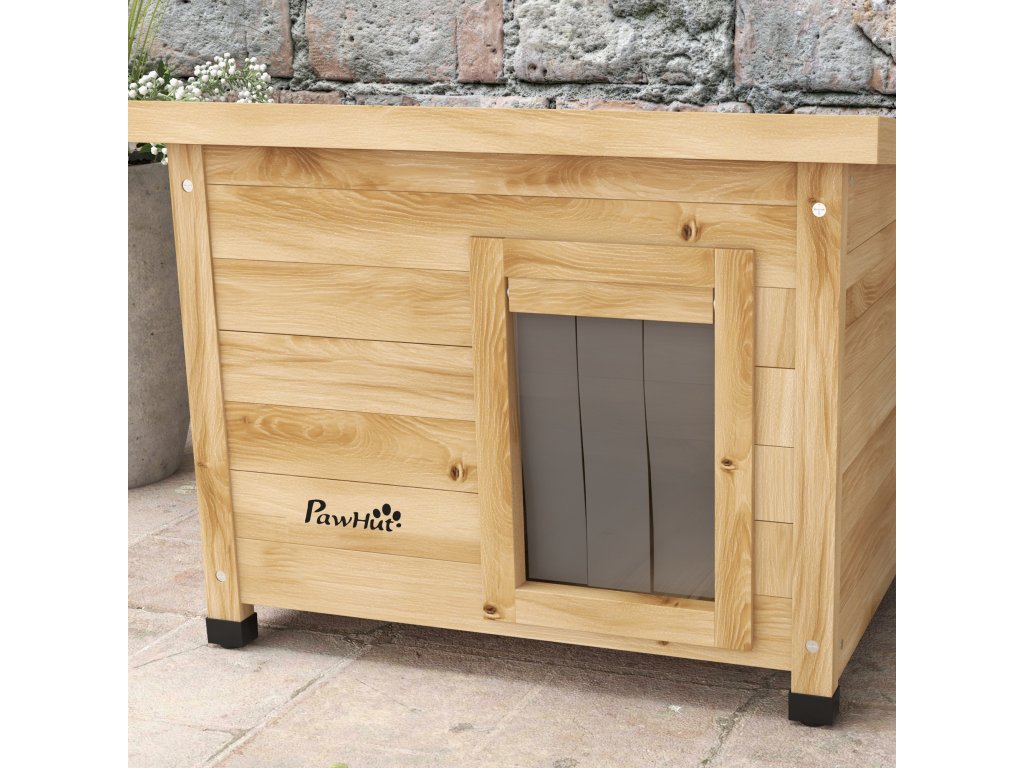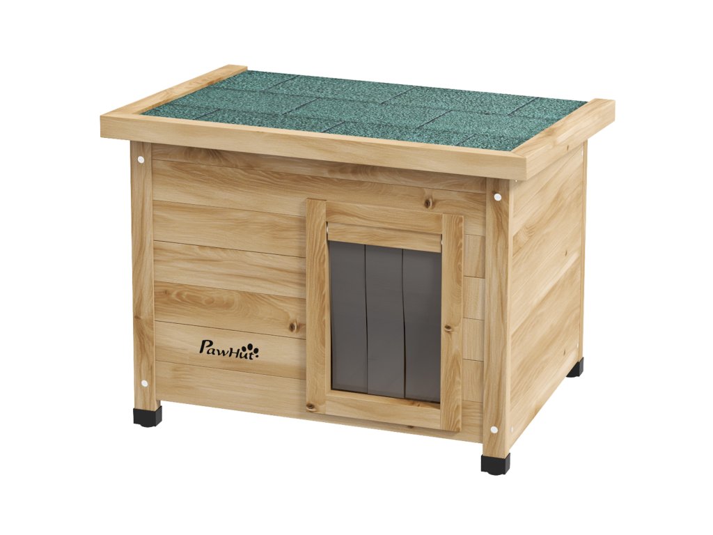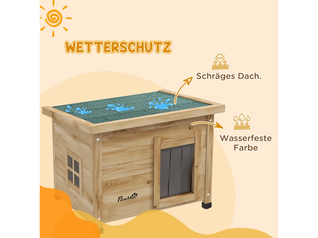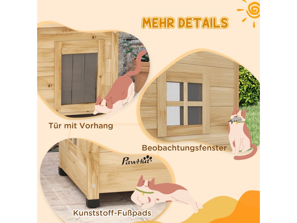 - Dřevěná konstrukce: Podlaha kočičího domku je vyrobena ze dřeva odolného proti korozi, nikoli z překližky nebo dřevotřísky, aby se časem neodlupovala. Má zvýšenou podlahu a nastavitelné opěrky nohou, které ji chrání před deštěm a blátem