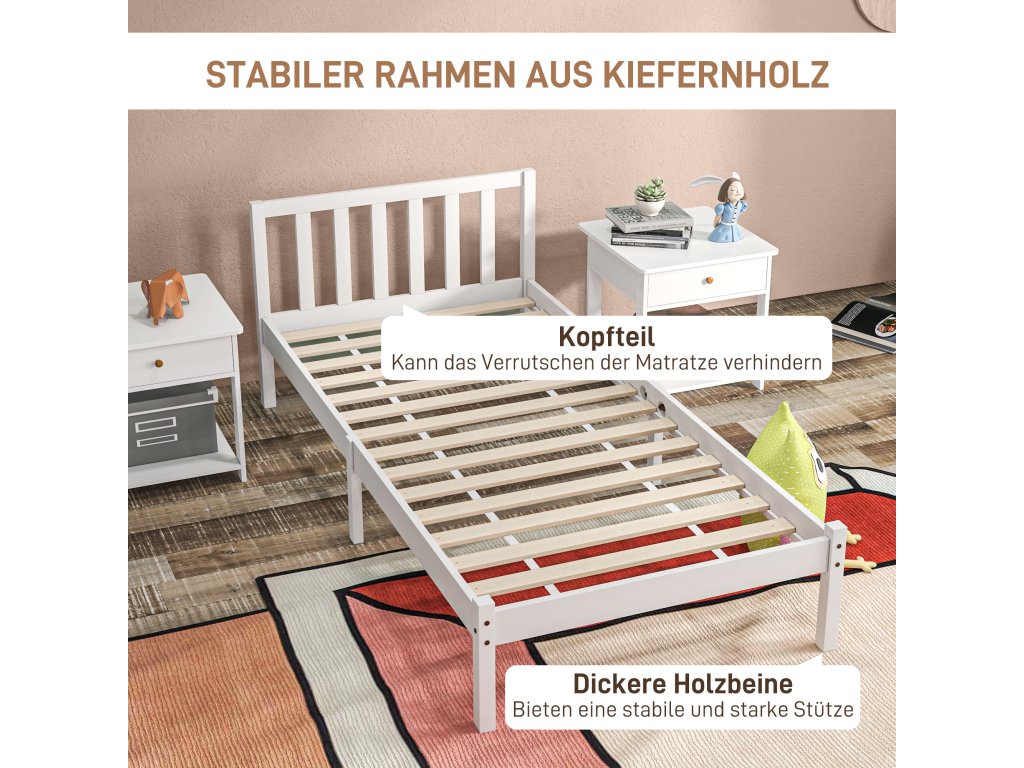 Dřevěný rám postele HOMCOM 208 x 96 cm s lamelovým roštem a čelem, elegantní rám jednolůžka do ložnice v bílé barvě | Aosom.de