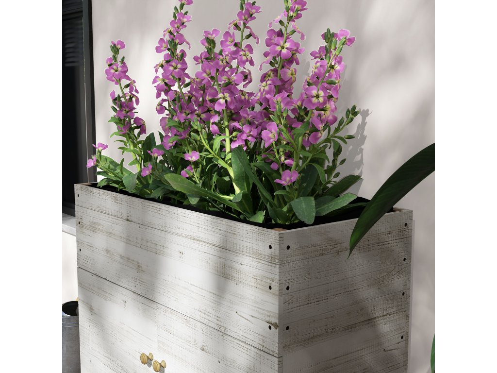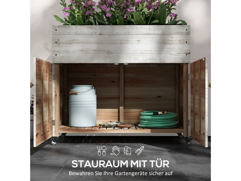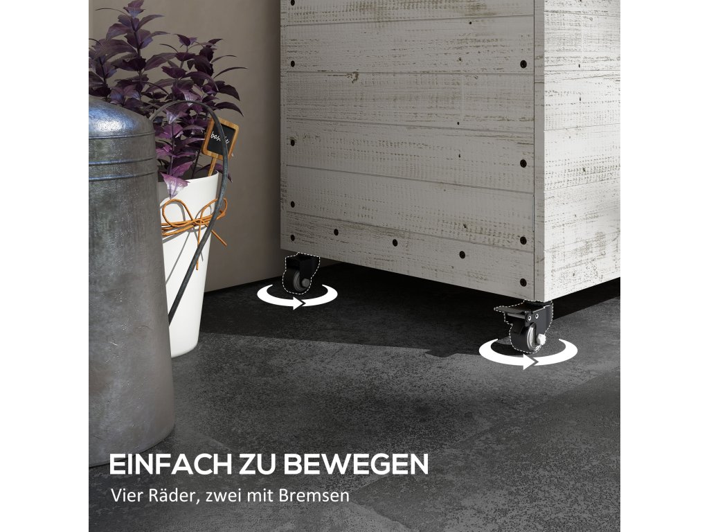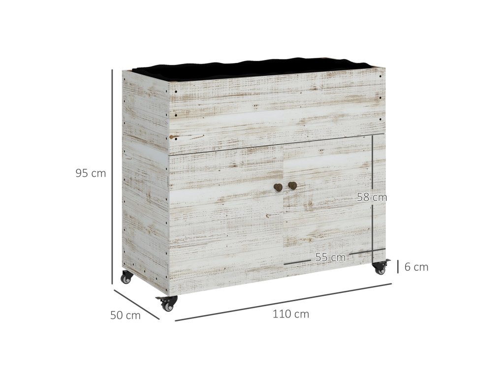 Dřevěný vyvýšený záhon se skříňkou, bylinkový záhon na kolečkách, truhlík na květiny 110 x 50 x 95 cm, truhlík na květiny s fleecovou tkaninou, bílý pro zahradu a balkon | Aosom.de
