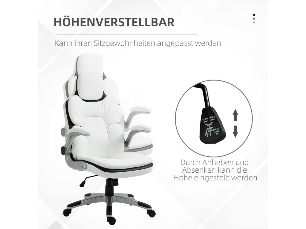 - Flexibilní nastavení: Snadno dosažitelná pneumatická páka umožňuje nastavit výšku sedadla a najít nejpohodlnější polohu. Područky počítačové židle lze zvednout nahoru, což usnadňuje její uložení pod stůl.