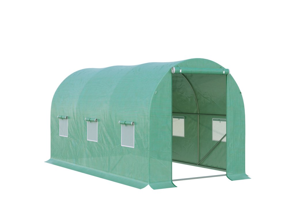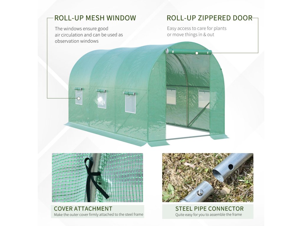 - Ideální skleník: Průhledné fólie jsou průsvitné, takže vaše rostliny budou mít vždy dostatek světla a tepla a zároveň budou chráněny před povětrnostními vlivy a zvířaty. Okna a dveře s dvojitými zipy zaručují dobrou cirkulaci vzduchu.