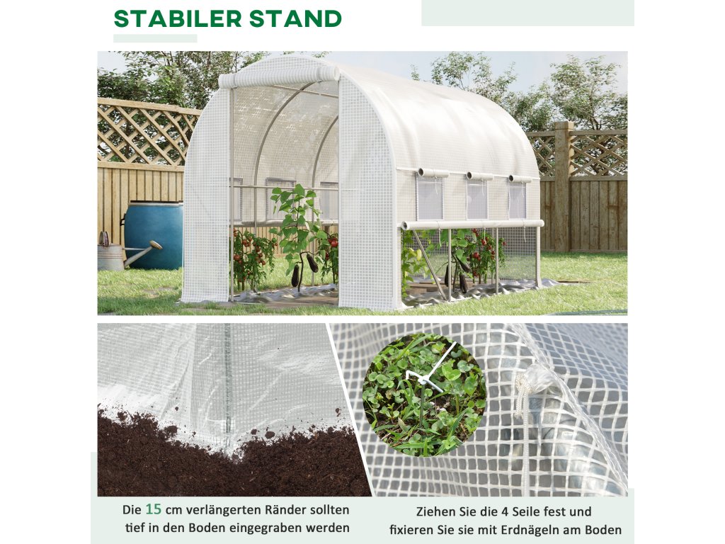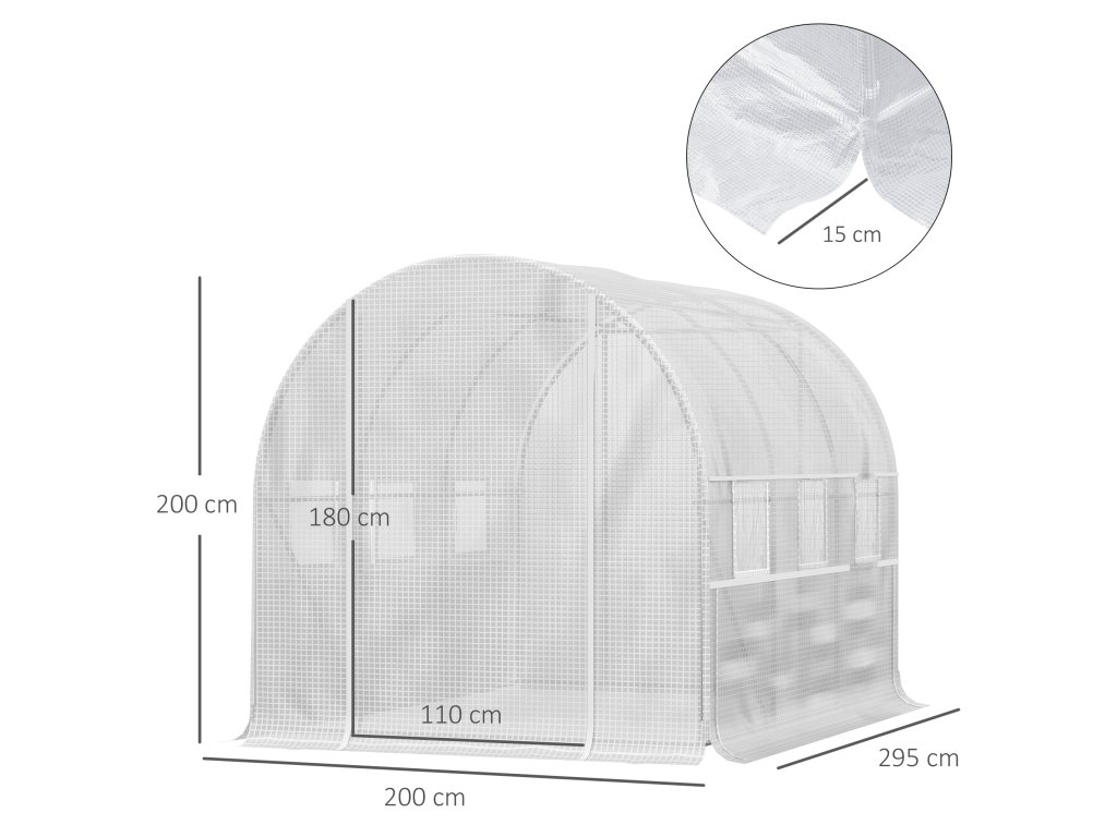 Fóliový skleník Outsunny 2,95x2x2m s rolovacími okny, UV ochrana a ochrana proti větru, ocelová konstrukce v bílé barvě | Aosom.de
