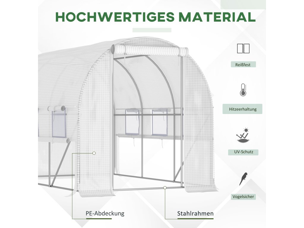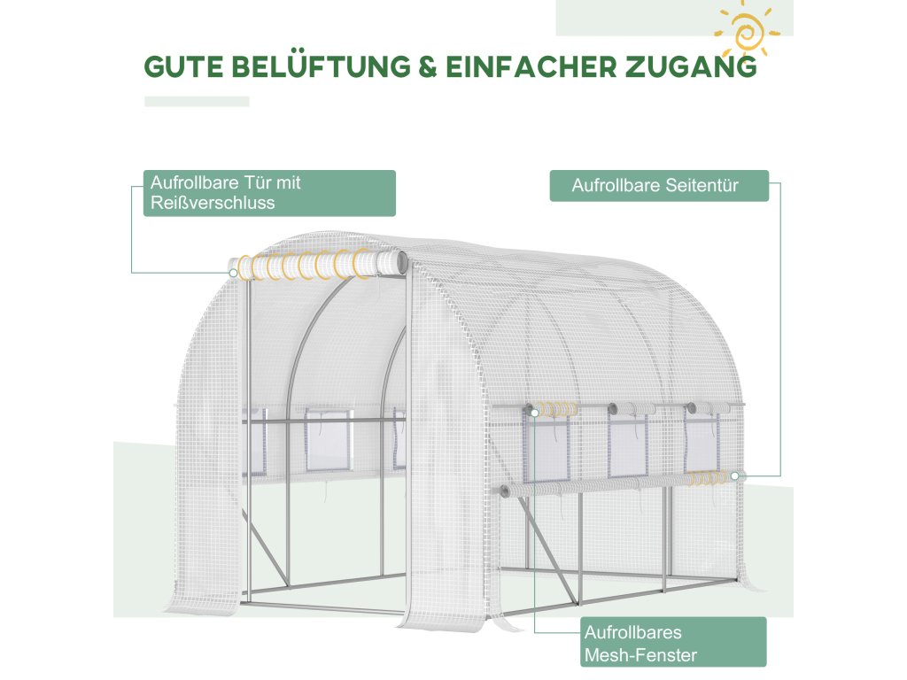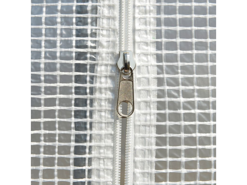- Dveře se zipem a rolovacími okny: Tunelový skleník má šest rolovacích oken, která jsou opatřena síťkou proti hmyzu a umožňují větrání a regulaci teploty. Lze je také snadno otevřít a v případě potřeby jednoduše zavřít