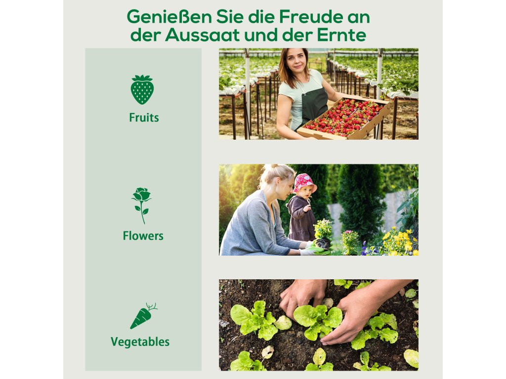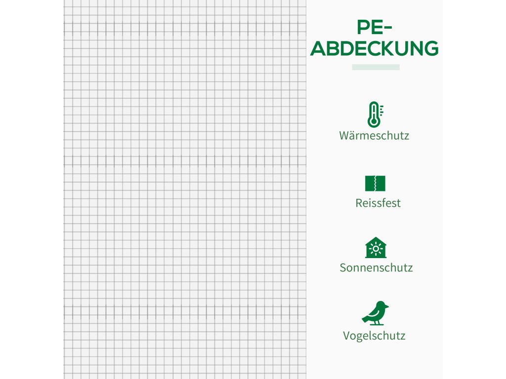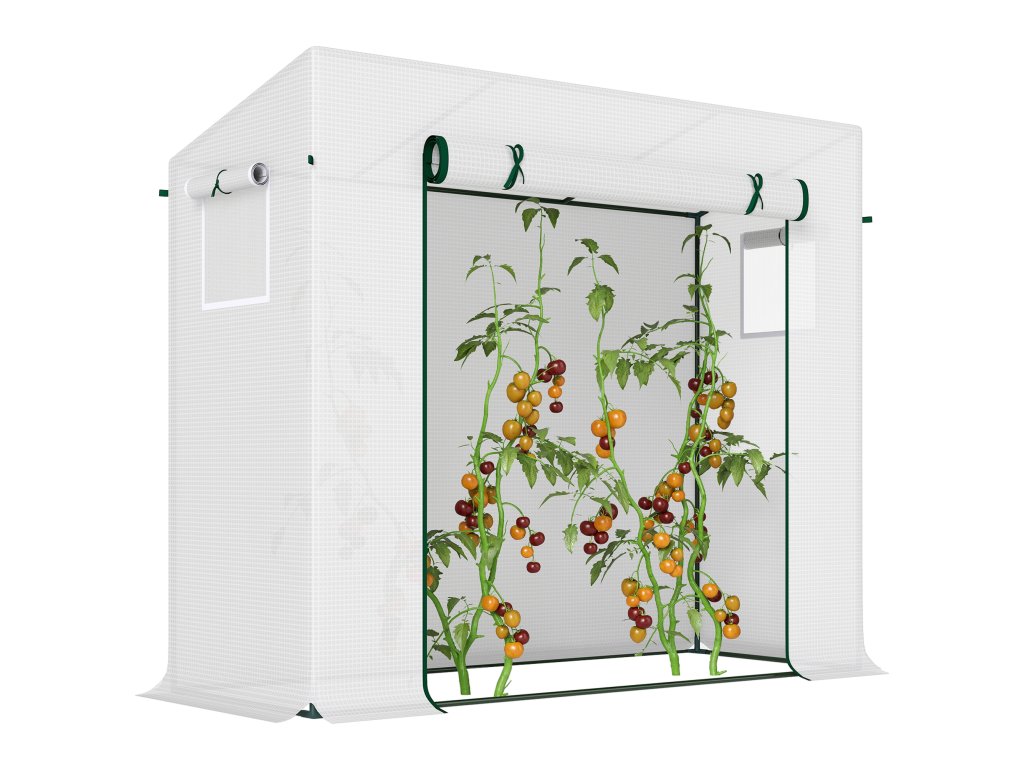 - Plastová plachta: Poskytuje optimální ochranu před chladem a větrem a podporuje zdravý růst. Velká dvířka rajčatárny pro snadný přístup a větrání, s prodlouženým okrajem pro zatížení nebo zakopání
