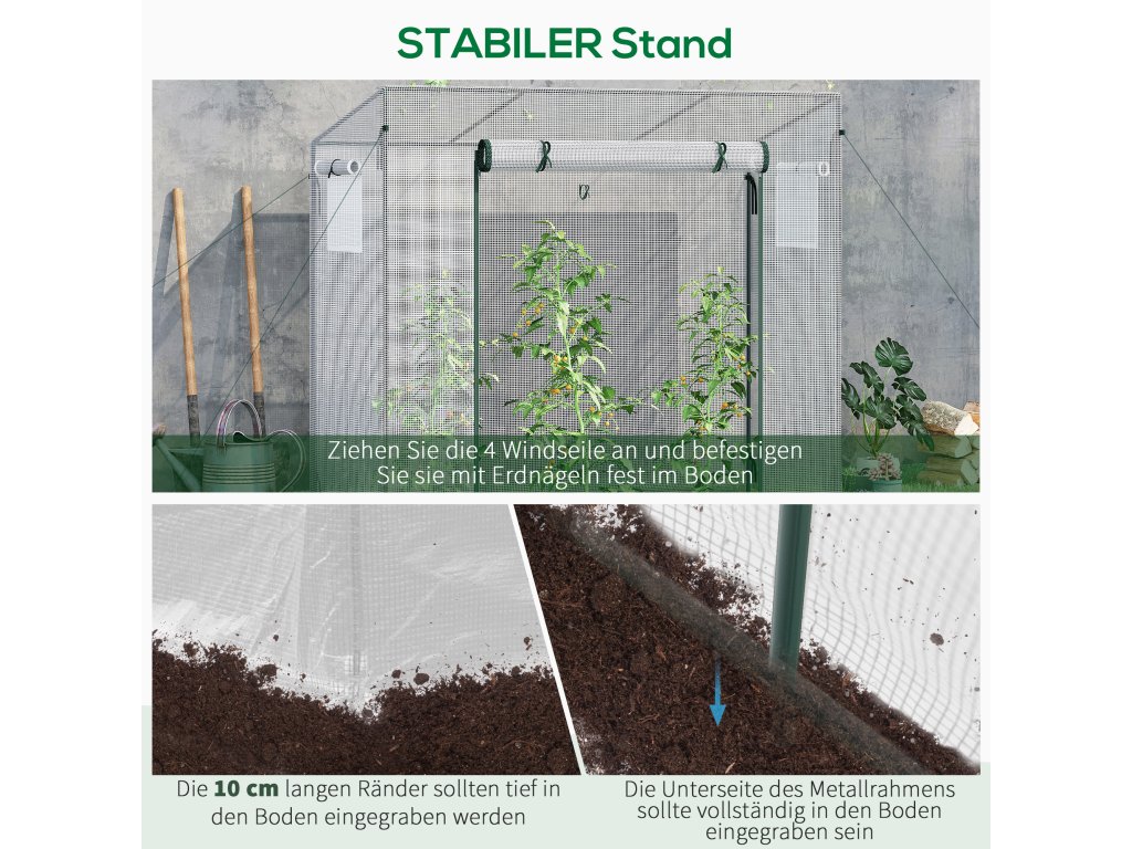 Kompaktní skleník Outsunny můžete používat na jaře nebo na konci podzimu, abyste zajistili ideální péči o rostliny. Robustní ocelový rám a praktické příslušenství chladicího rámu zaručují stabilitu, zatímco plastový kryt chrání před povětrnostními vlivy a zvířaty a udržuje teplo. Díky rolovacím dveřím skleníku na rajčata jsou vaše rostliny snadno přístupné.