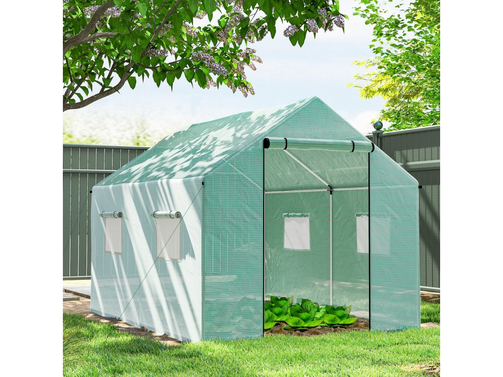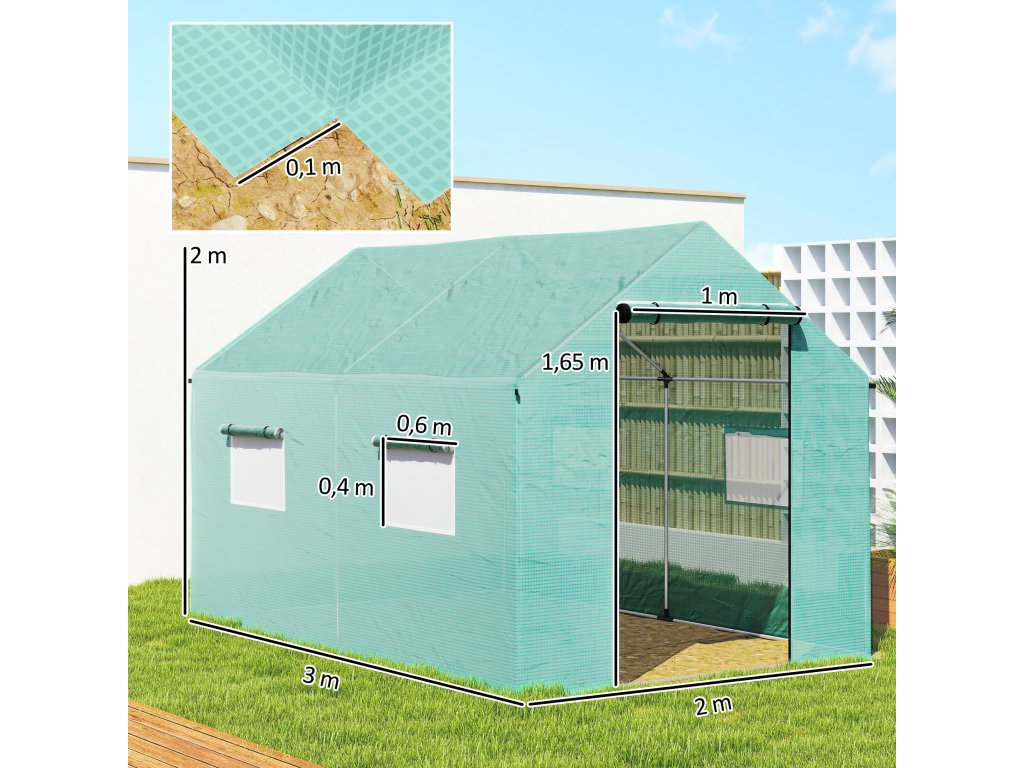Fóliový skleník Outsunny 2x3x2m odolný proti větru s rolovacím oknem a UV ochranou, ideální pro rajčata, robustní ocelová konstrukce v zelené barvě |