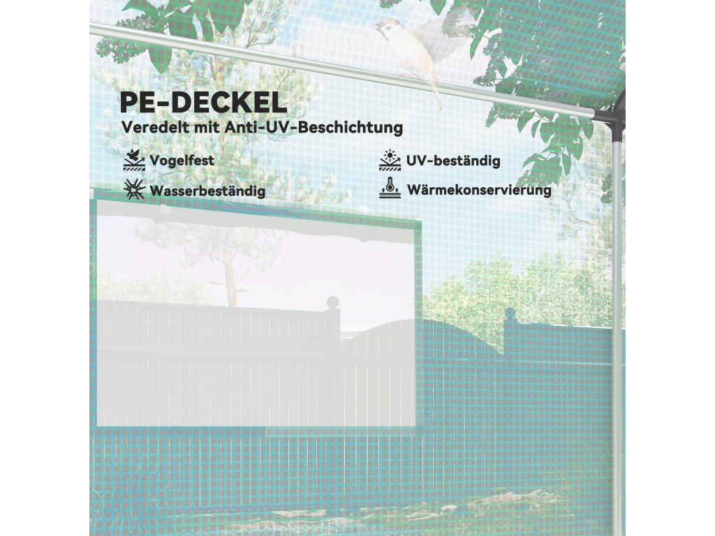 - ✔ PE kryt poskytuje uvnitř ochranu proti UV záření a lehkým povětrnostním vlivům, takže rostliny mohou dobře růst