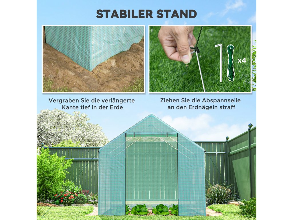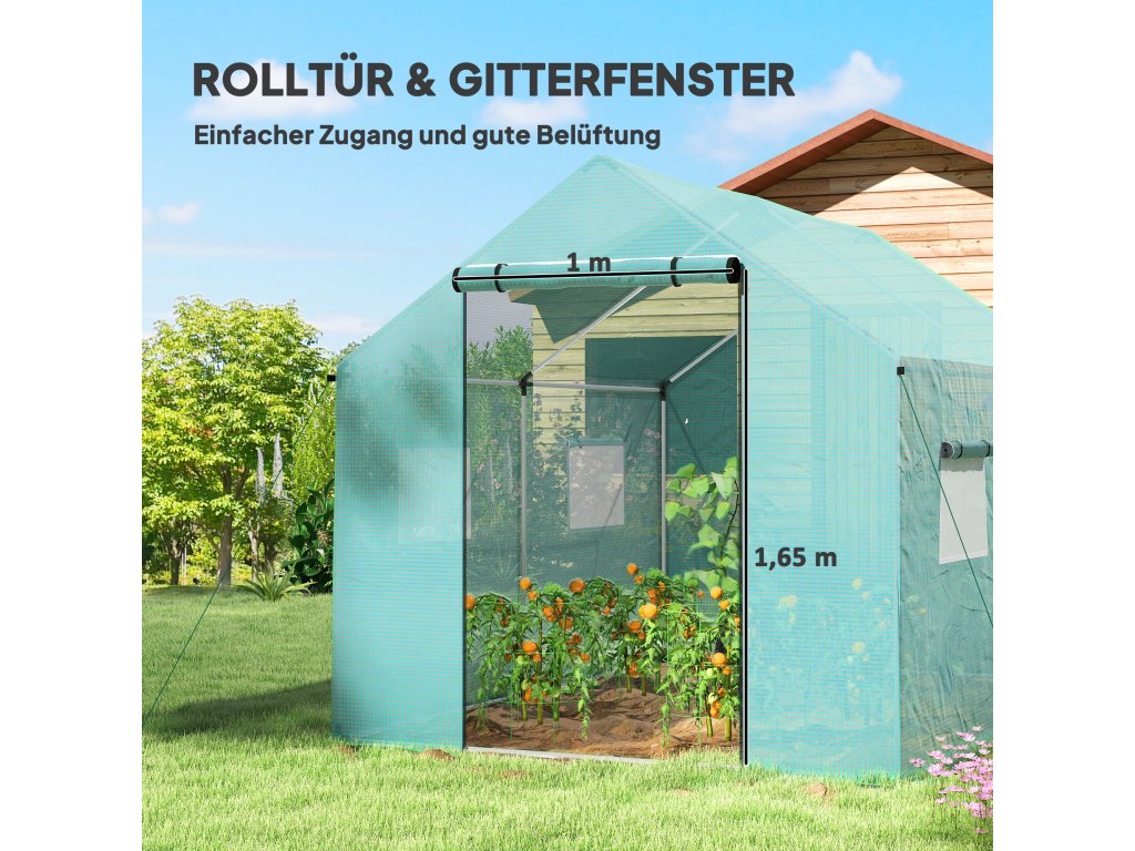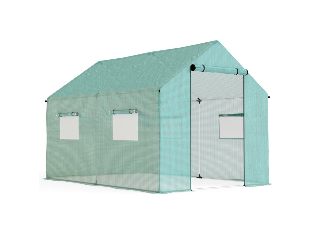 - Široké dveře a okna se síťkou: Velké rolovací dveře se zipem a čtyři okna umožňují snadný přístup do skleníku a zajišťují křížové větrání, díky čemuž můžete regulovat teplotu a vlhkost podle svých představ. Všechna okna jsou opatřena drátěnými sítěmi, které brání nežádoucím okřídleným hostům v přístupu ven