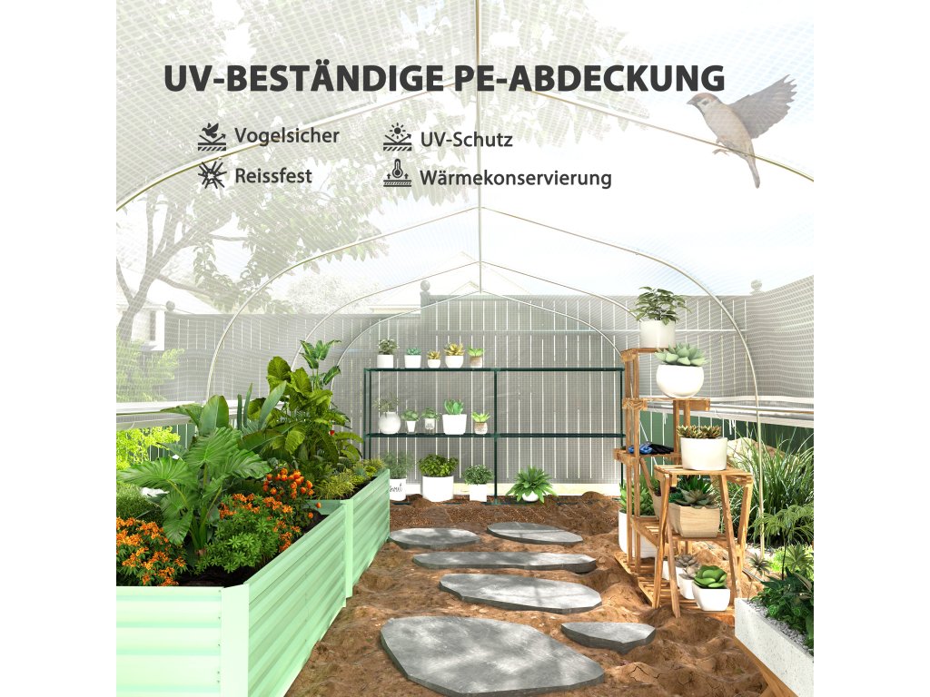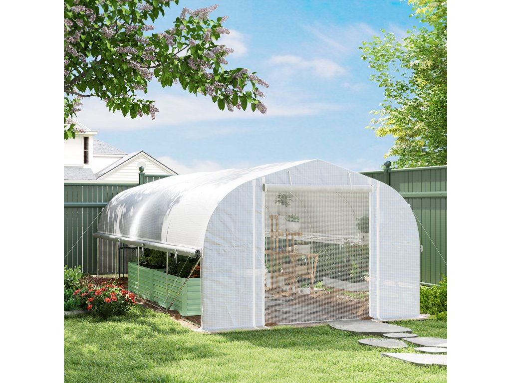 Zažijte celoroční zahradničení s prostorným skleníkem Outsunny. Má několik otvorů se síťovými vložkami pro optimální větrání a snadný přístup, takže se vašim rostlinám bude dařit za každého počasí. Odolná fólie tunelového skleníku o hmotnosti 140 g/m² propouští 85 % slunečního světla a chrání před škodlivým UV zářením. Ideální pro zahradní nadšence, kteří hledají prostorný tunelový skleník pro pěstování svého zahradního ráje!